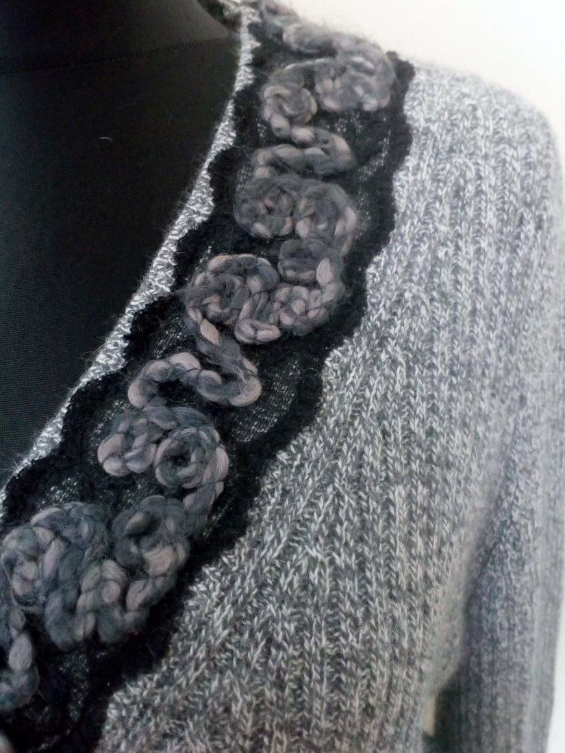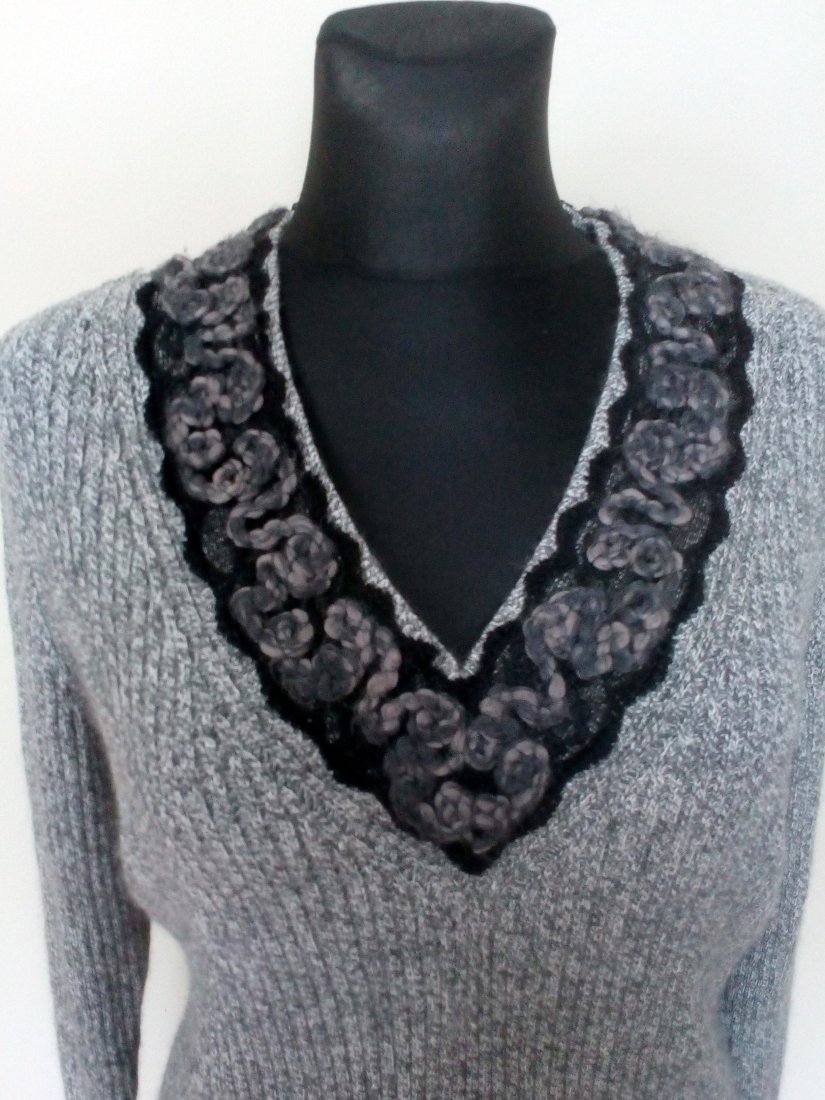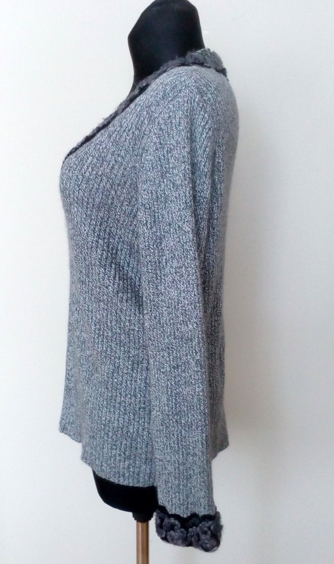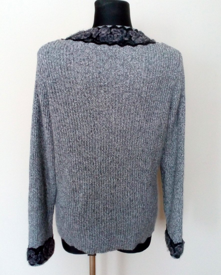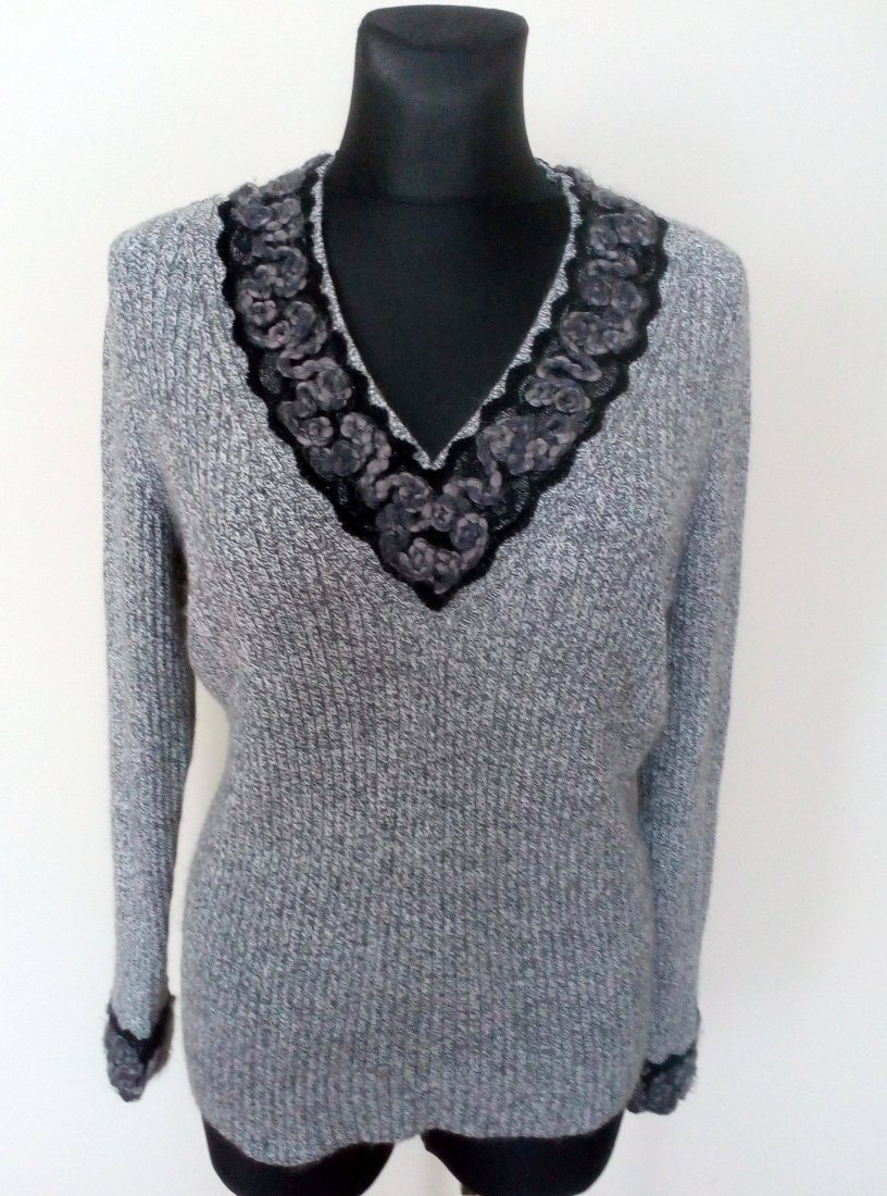 sweter w melanżowym szaro-białym kolorze, dekolt w szpic, wykończenia z czarnej koronki i z wełnianej aplikacji