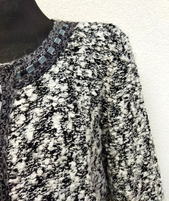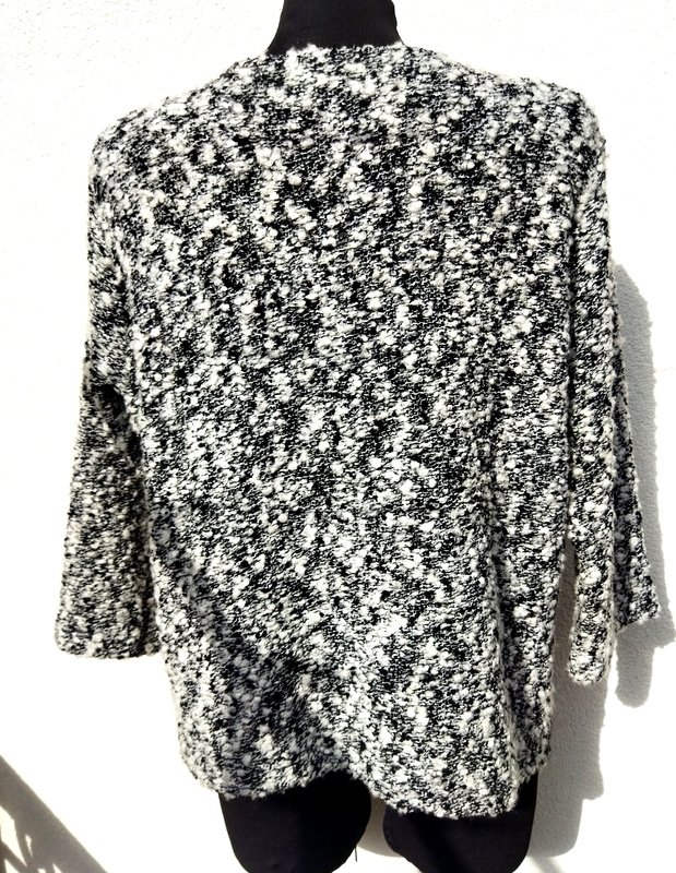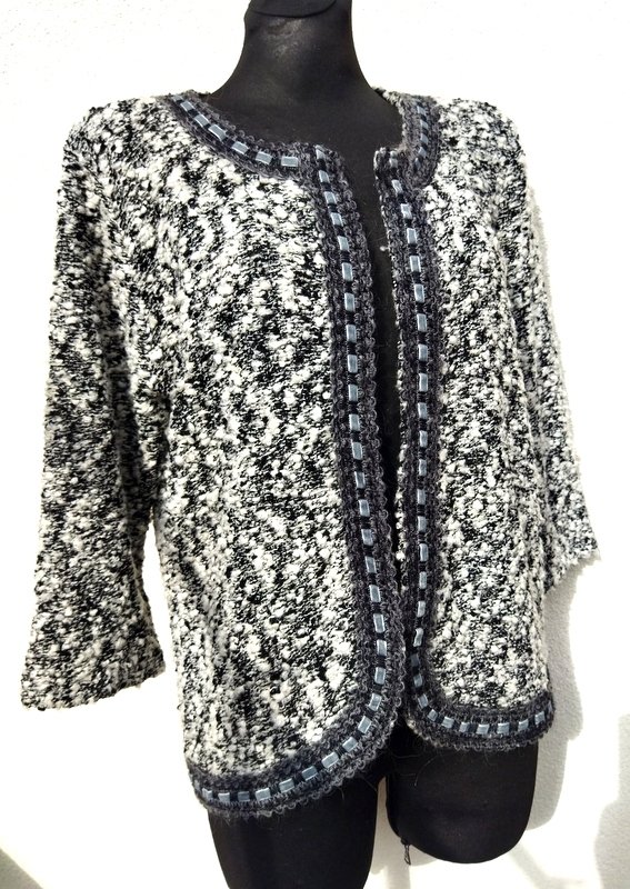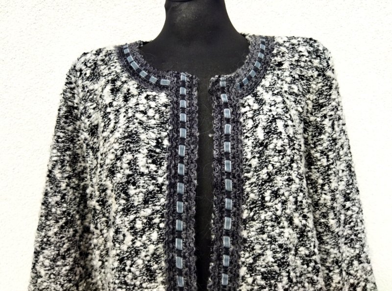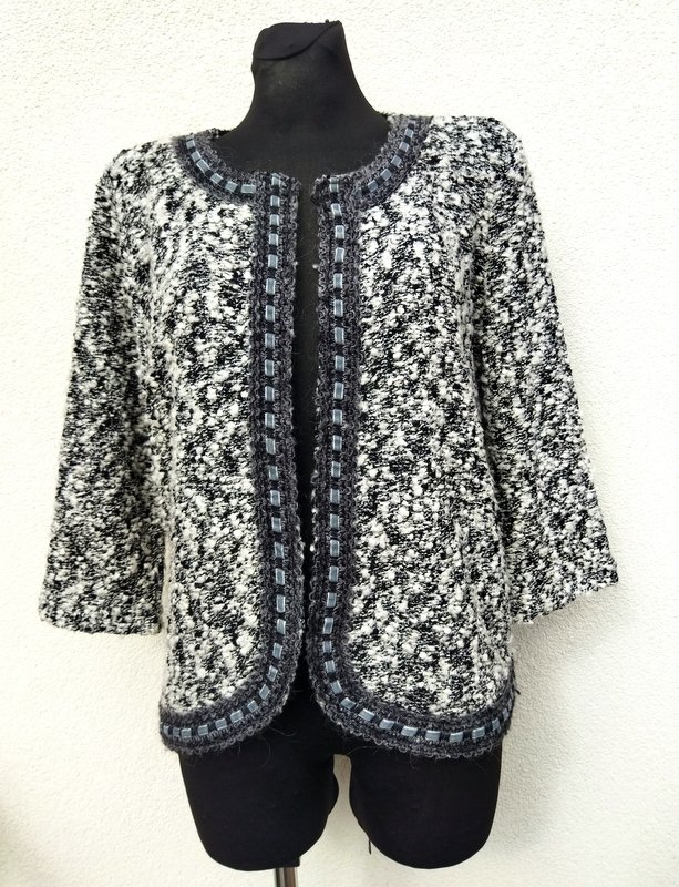 Dzianinowy żakiet lub sweter z czarno-białej włóczki z fakturą boucle. Obszyty dzianinową taśmą z przeciąganą welurową tasiemką. Bez kołnierza z owalnym dekoltem , z rekami 3/4, z zaokrąglonymi połami przodu.