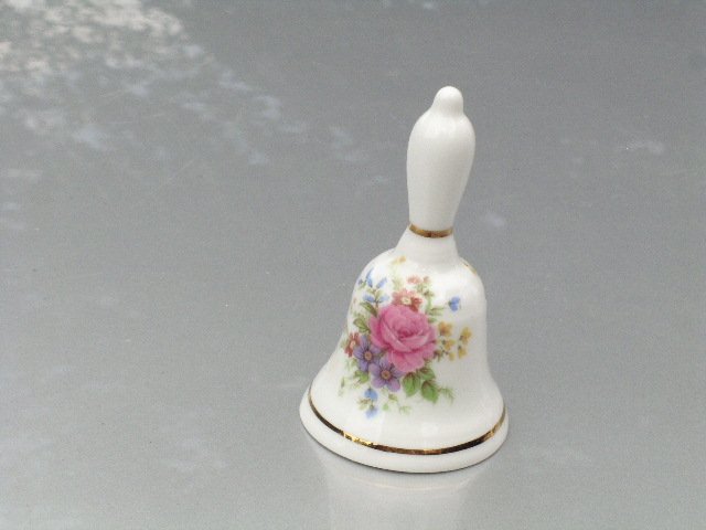 Absolutnie urzekający mini filigranowym rozmiarem porcelanowy dzwoneczek w bukietowym, romantycznym wydaniu. Dźwięczy równie uroczo jak wygląda :) Złocenia i jedwabiście szkliwiona biel szlachetnej porcelany. Serce koralikowe, precyzyjne. Sygnowany Peter Gosling, England. Uwaga ! rozmiary: 4,5 x 7 cm. Stan zachowania bardzo dobry.