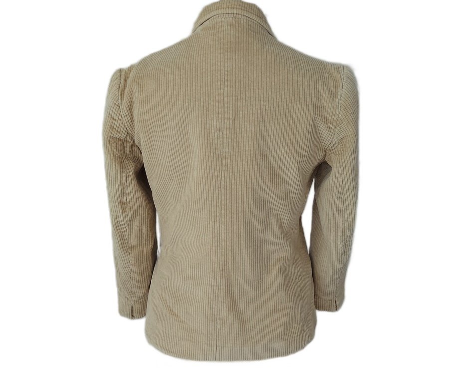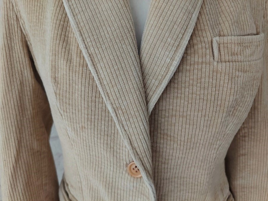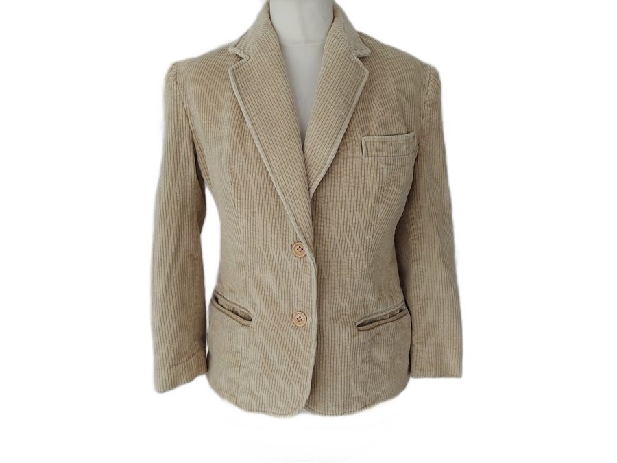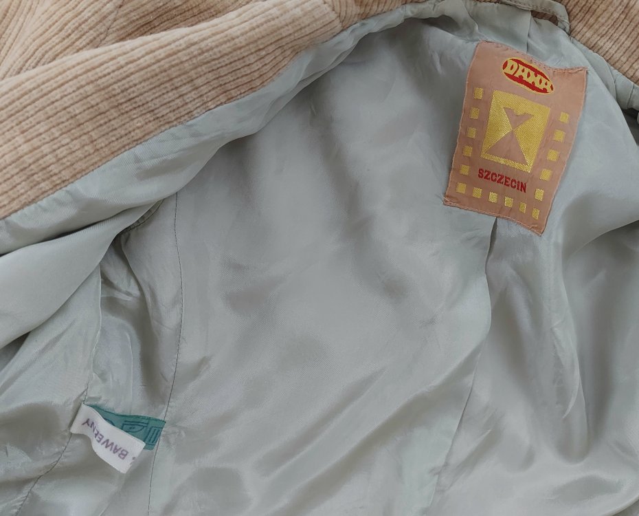 Żakiet sztruksowy słynnej modowej, historycznej już marki DANA Szczecin. Mieniący się sztruks w kolorze beżowym, jasno musztardowym, bawełniany.