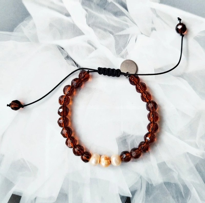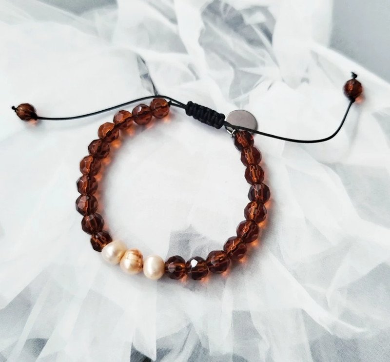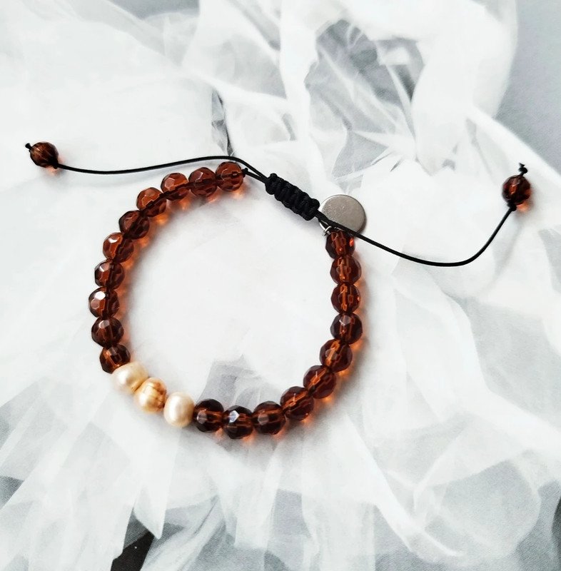 Bransoletka wykonana z jubilerskiego sznurka, fasetowanych kwarców oraz pereł hodowlanych .