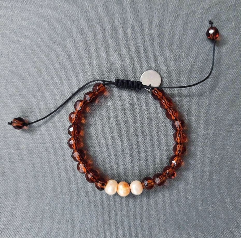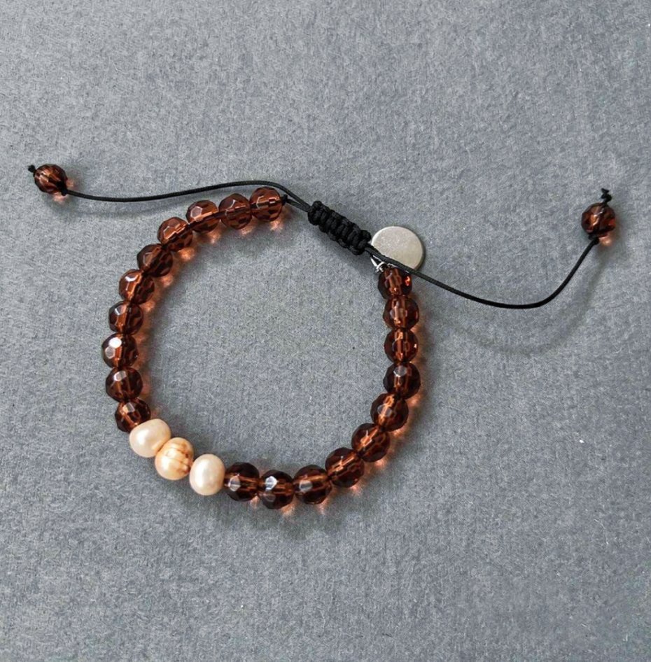 Bransoletka wykonana z jubilerskiego sznurka, fasetowanych kwarców oraz pereł hodowlanych .