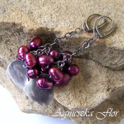 Kolczyki wykonane ze srebra pr.925. Bordowe naturalne perełki zawieszone w gronach. Ich wymiary to ok. 5mm-7mm. Klepane w blaszce srebra serca 15mm. Całość ręcznie oksydowana i polerowana. Bigle angielskie.