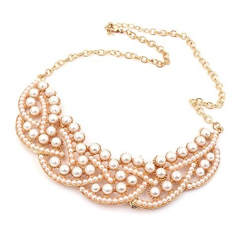 Śliczny naszyjnik w formie kolii z koralikami imitującymi perełki. Metal w kolorze złotym.