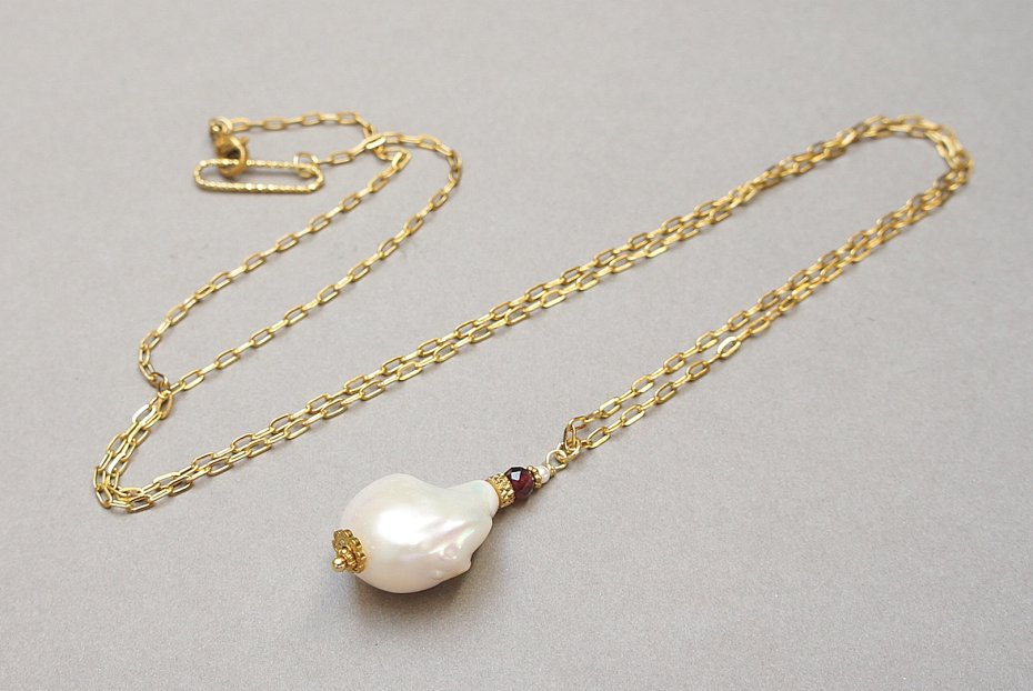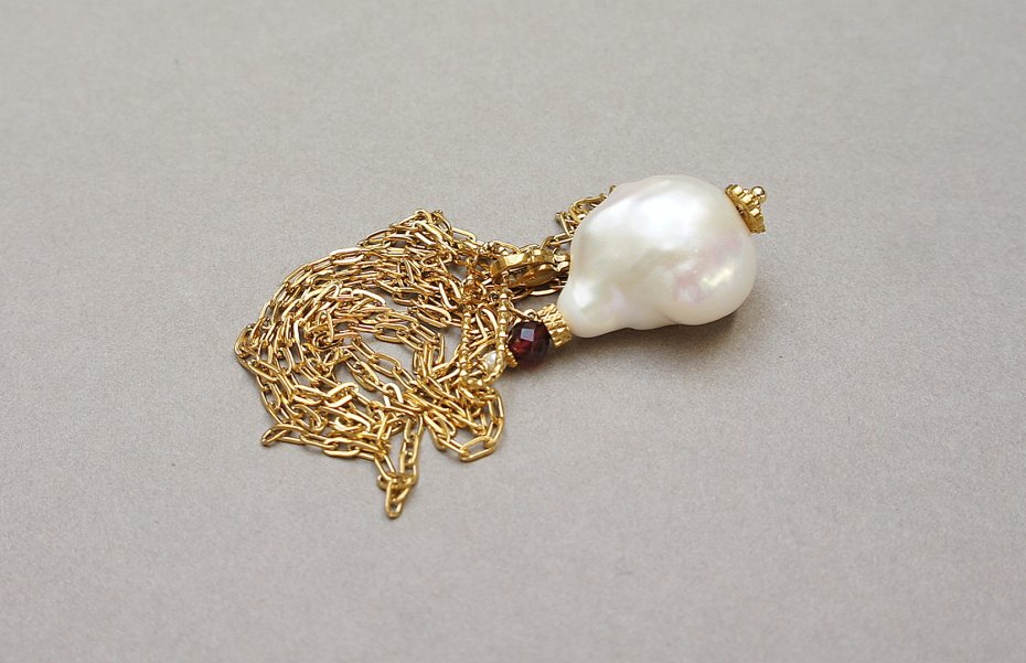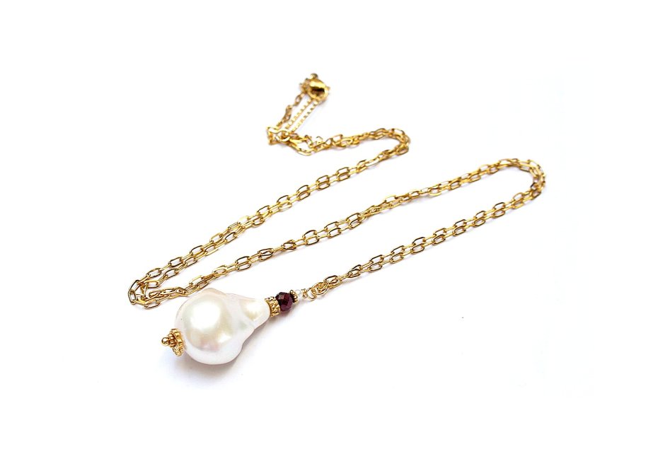Długi naszyjnik wykonany z naturalnej dużej perły barokowej [ok. 22mm], fasetowanej kuleczki granatu [4mm] oraz z pozłacanej stali szlachetnej. Długość łańcuszka: 72cm, długość części wiszącej ok. 4cm.