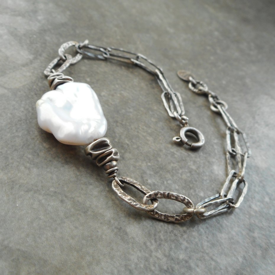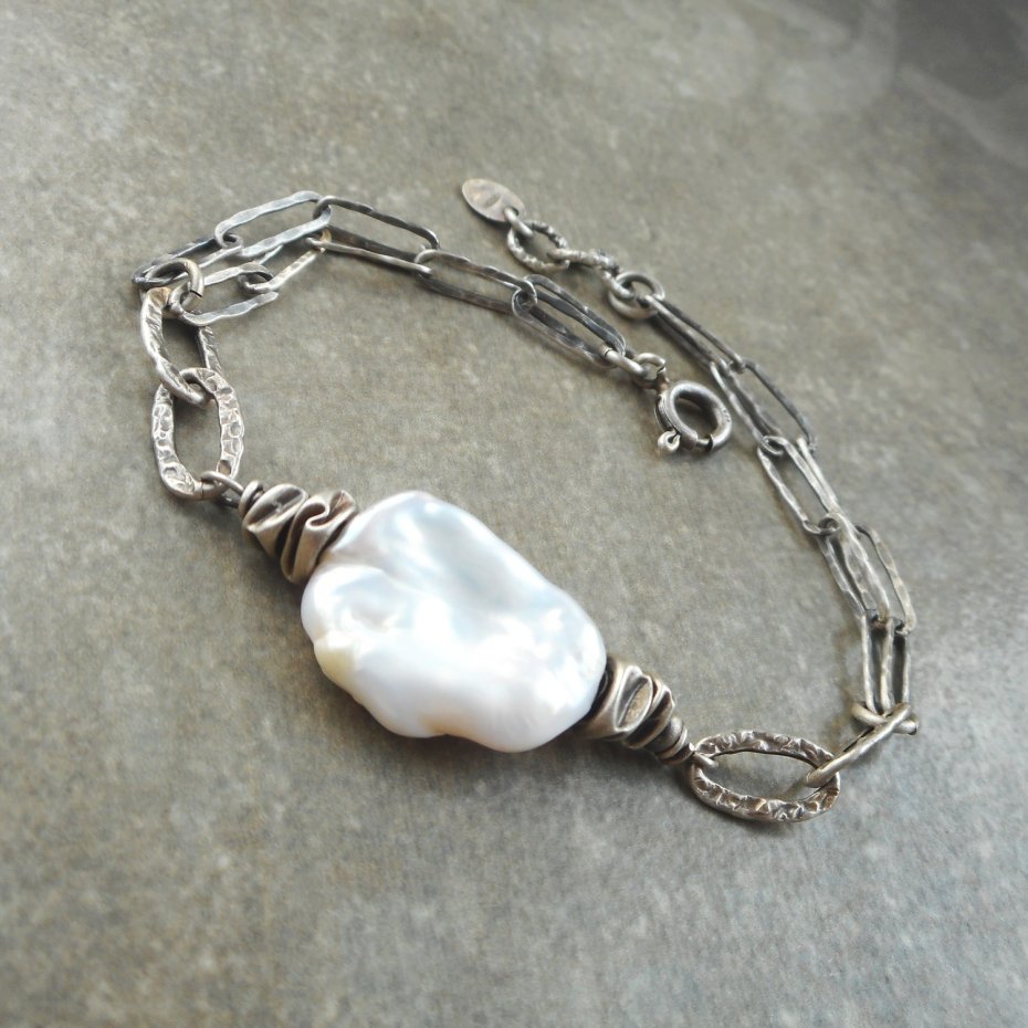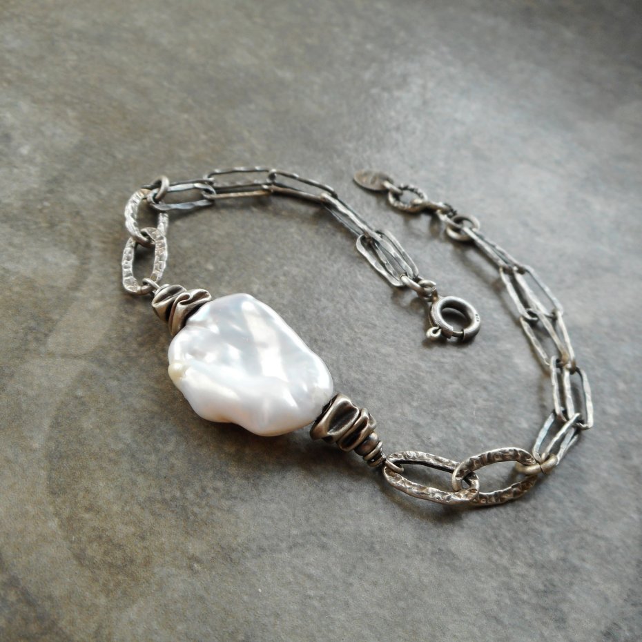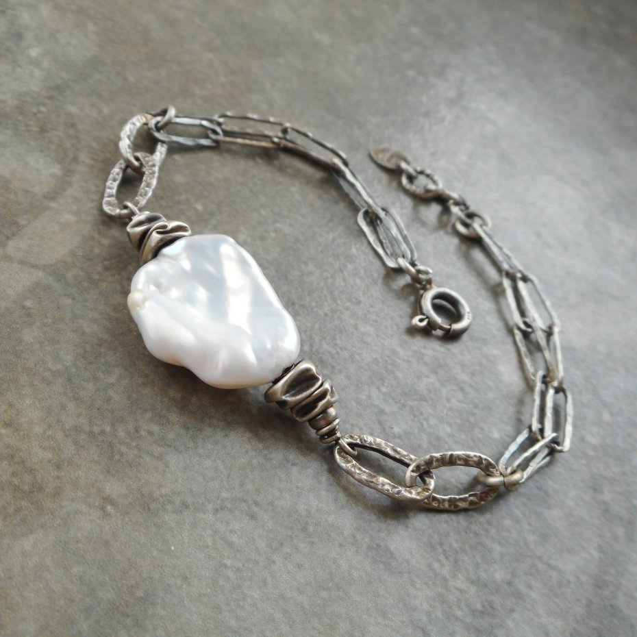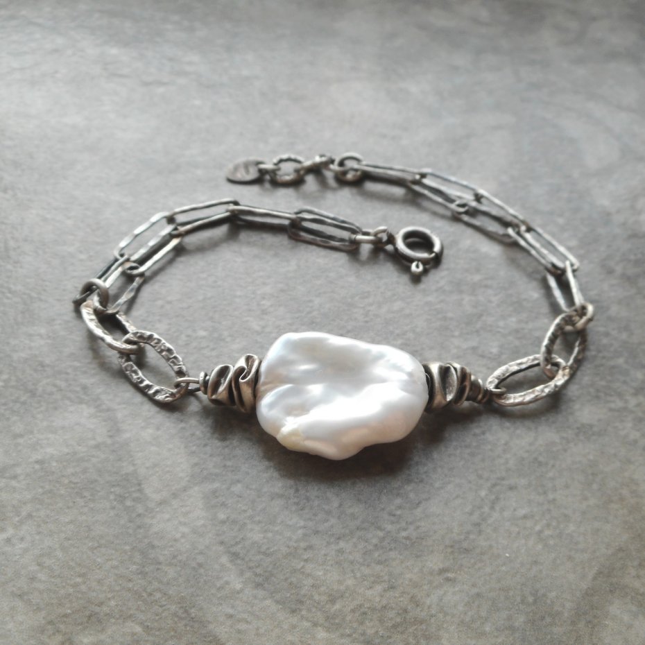 Stylowa bransoletka z kamieni naturalnych i szlachetnego srebra; charakteru biżuterii nadaje połączenie nieregularnej, dużej perły hodowlanej z fakturowanym, solidnym łańcuchem o dużych oczkach ( 12 mm) z oksydowanego srebra.