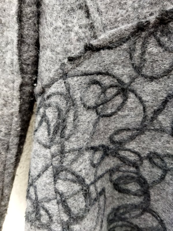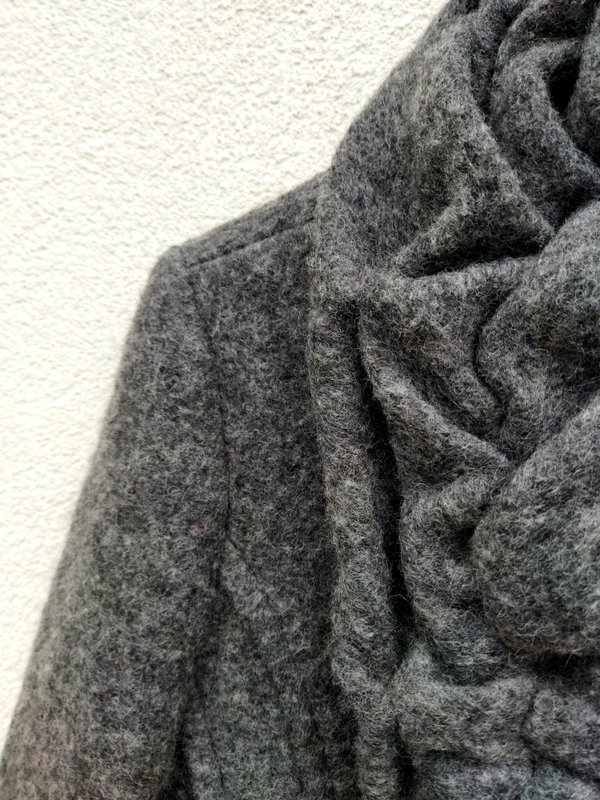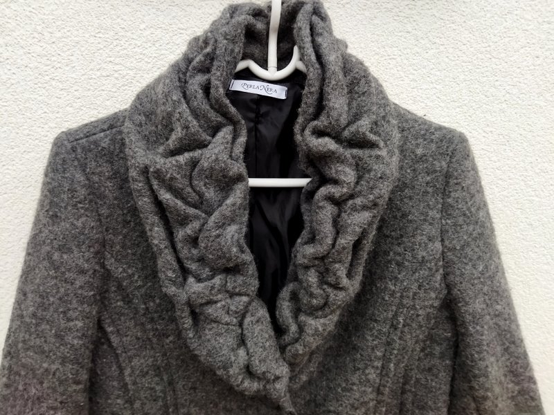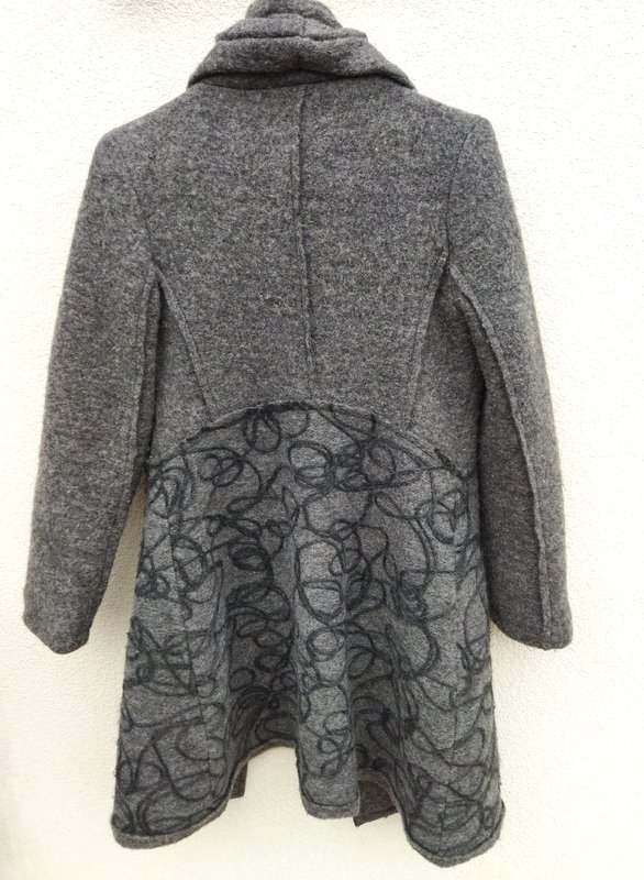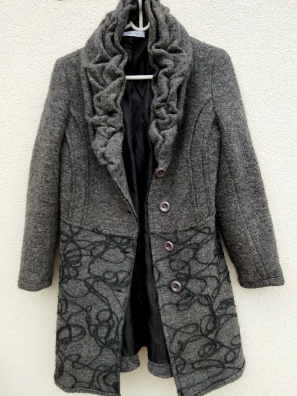 Zgrabny płaszcz z wełny parzonej z domieszką w szarym kolorze z wykończeniem ,, na surowo", dół haftowany ciemniejsza włóczką. Odcinany w pasie, góra dopasowana z drapowanym kołnierzem, dół trapezowy lekko poszerzany. Zapinany na guziki. Całość na podszewce.