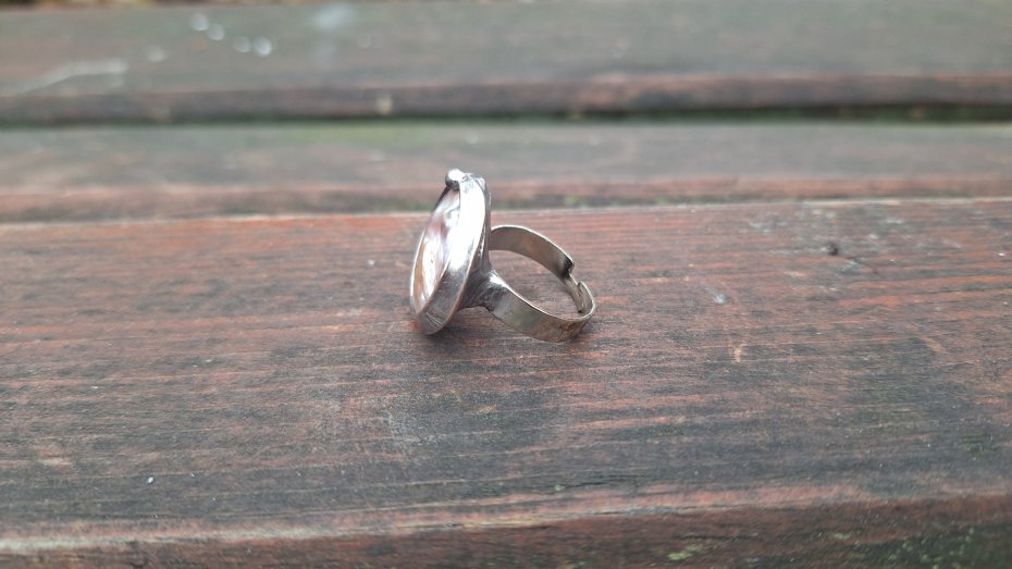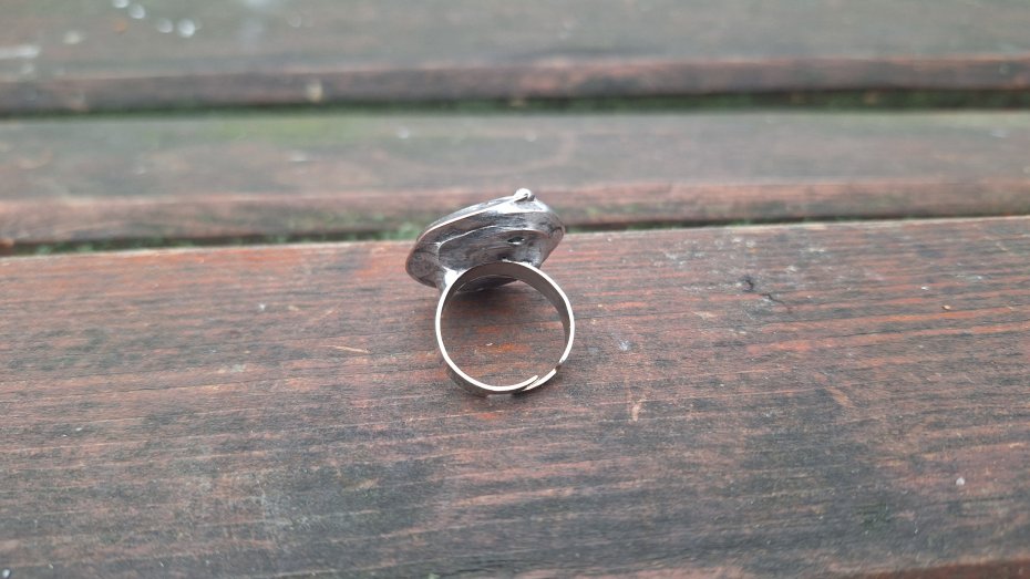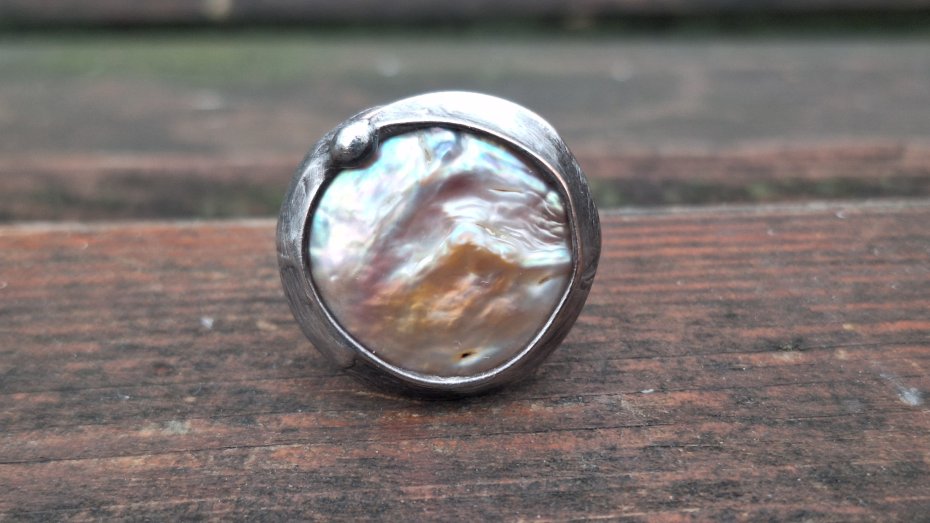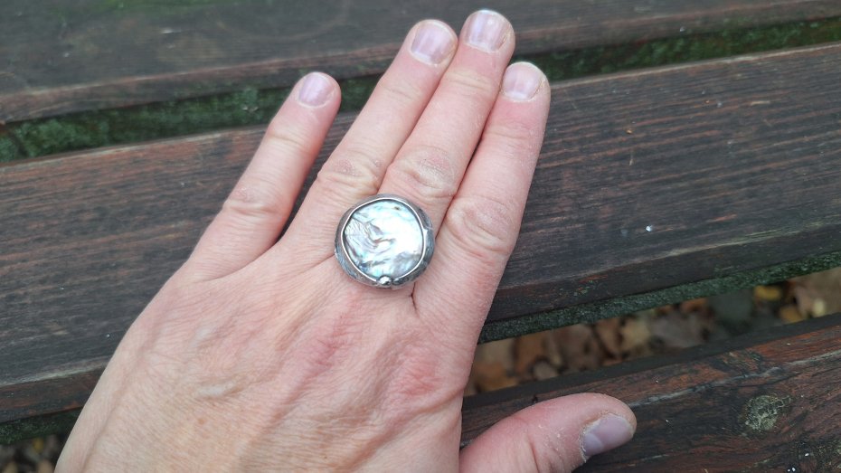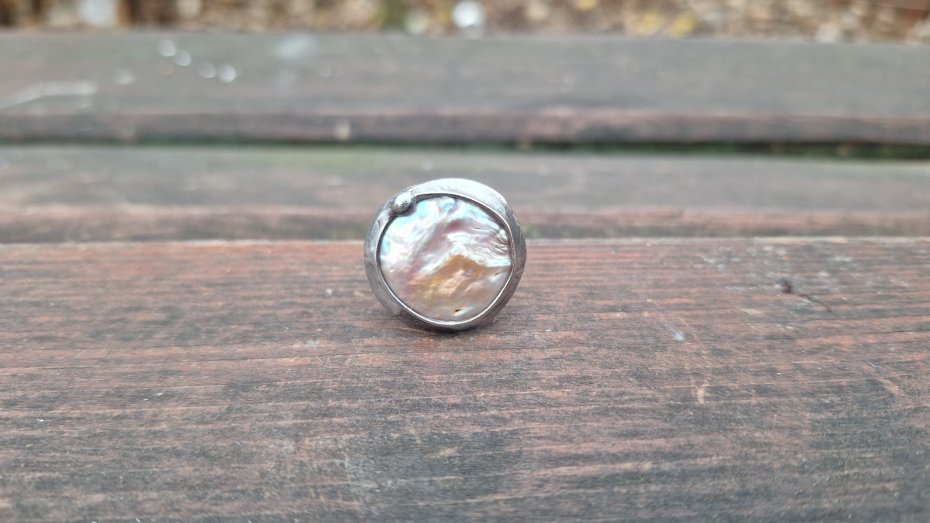 Pierścionek wykonany z miedzi, cyny i perły. Wymiary ok. 2.2 na 2.2 cm. Regulowany. Nie jest ciężki.