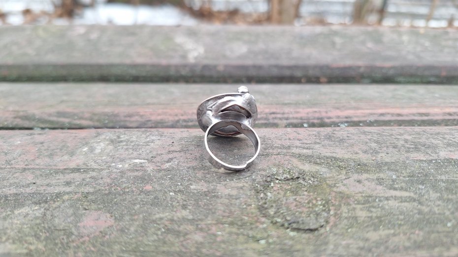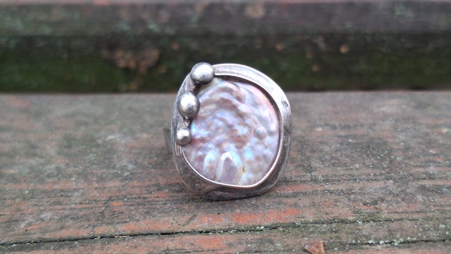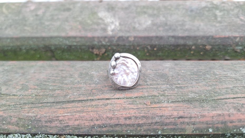 Pierścionek wykonany z miedzi, cyny i perły. Wymiary ok. 2.2 na 2.2 cm. Regulowany. Nie jest ciężki.