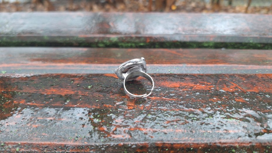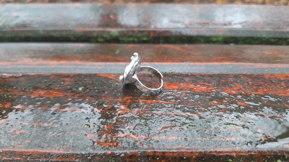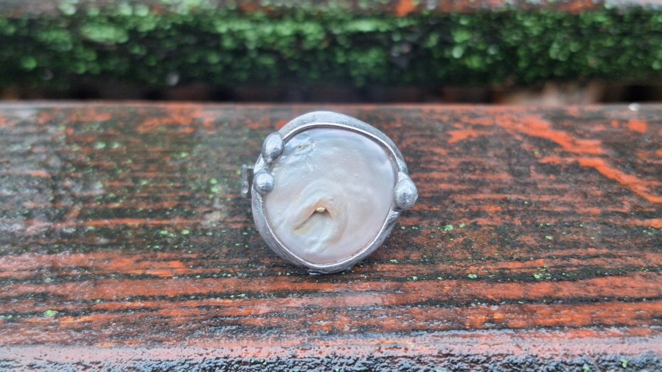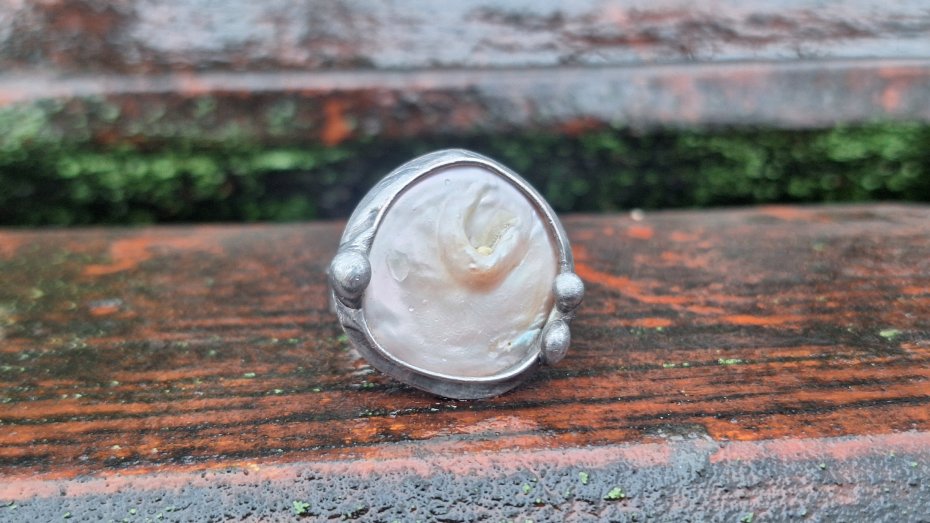 Pierścionek wykonany z miedzi, cyny i perły. Wymiary ok. 2 na 2 cm. Regulowany. Nie jest ciężki.