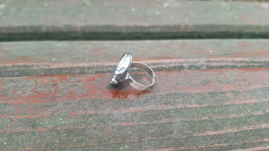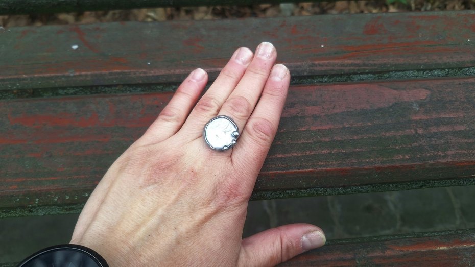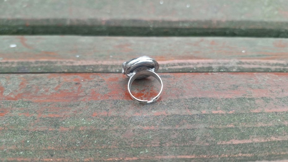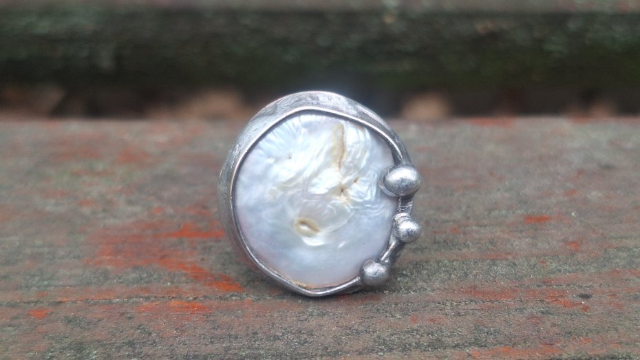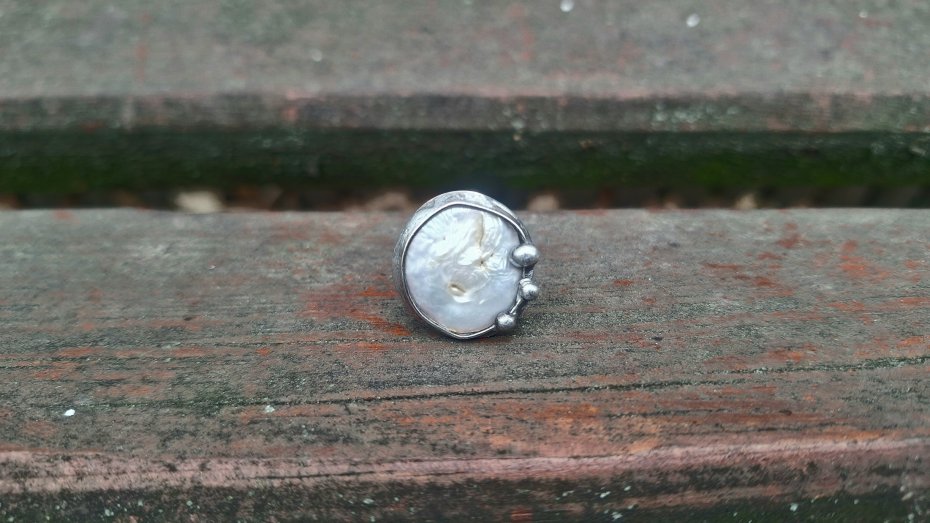Pierścionek wykonany z miedzi, cyny i perły. Wymiary ok. 2 na 2 cm. Regulowany. Nie jest ciężki.