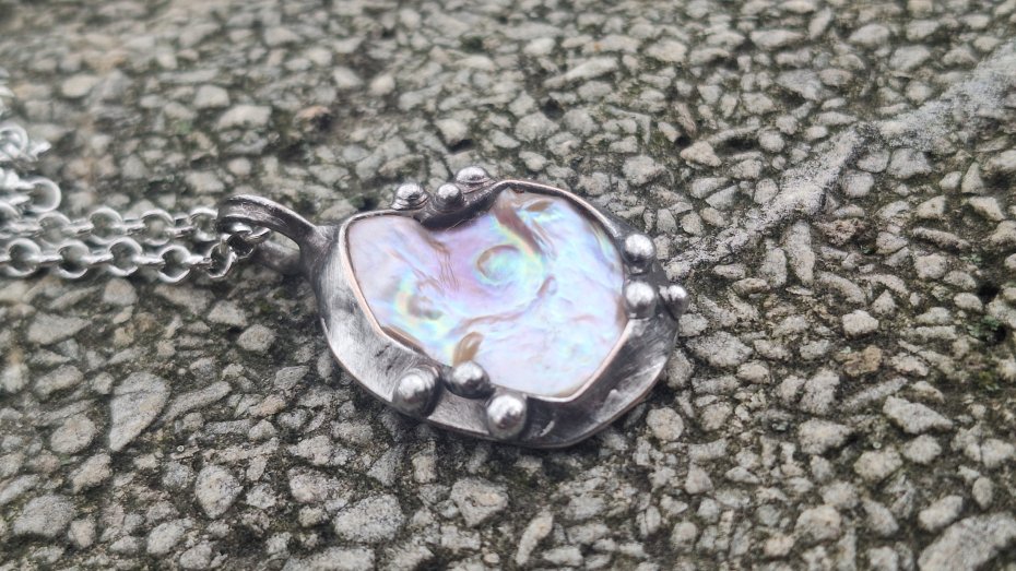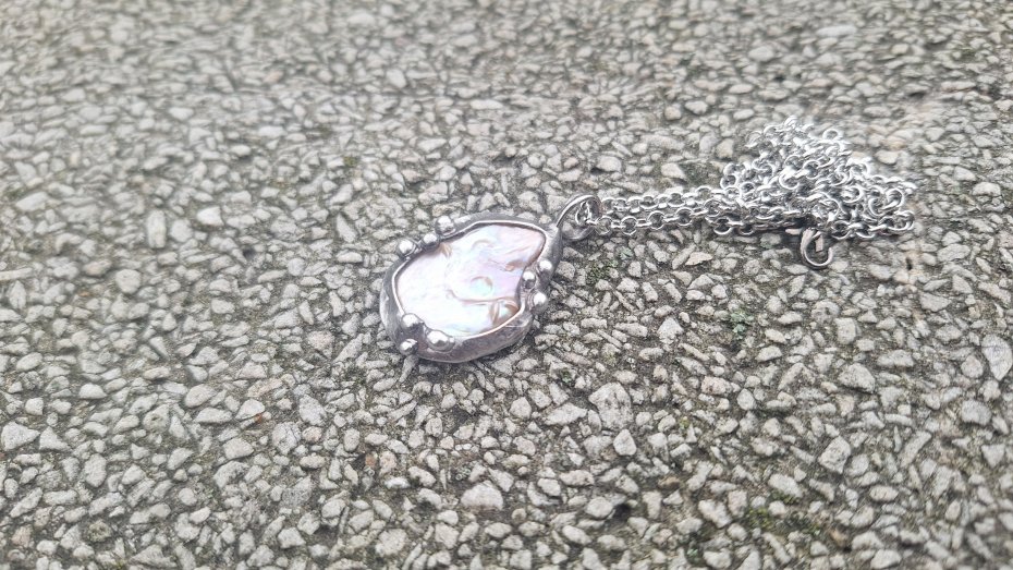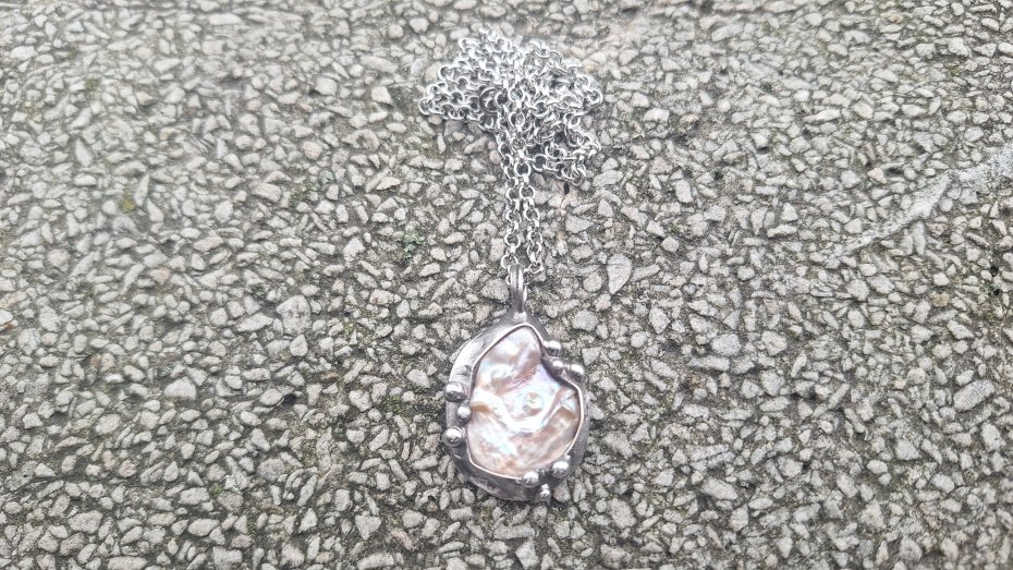 Wisiorek wykonany z miedzi, cyny i perły. Wymiary ok. 3 na 2.2 cm. Zawieszony na łańcuszku o długości ok. 50 cm.