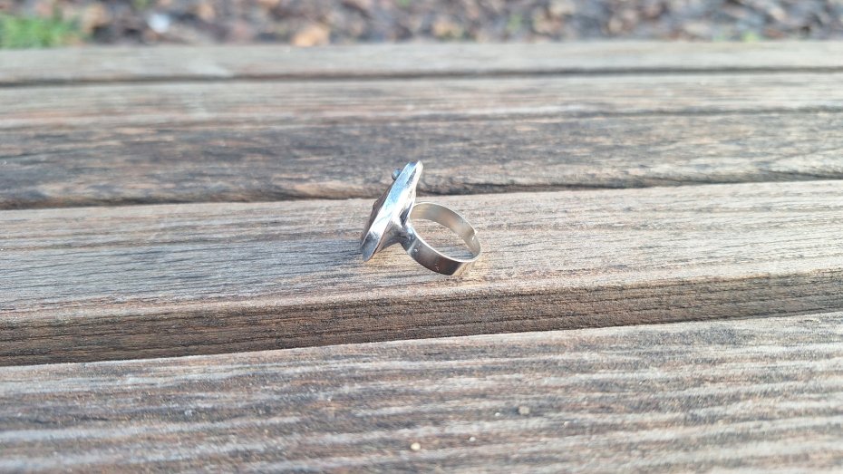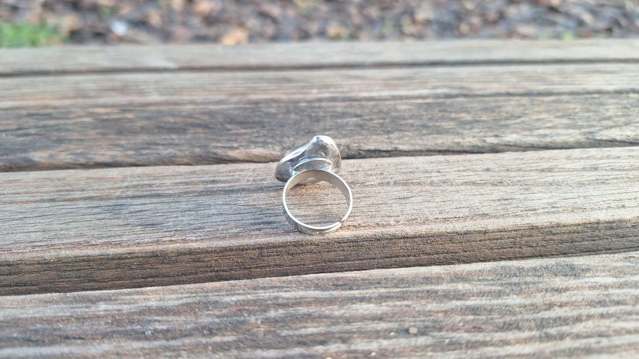 Pierścionek wykonany z miedzi, cyny i perły. Wymiary ok. 2.2 na 1.7 cm. Regulowany. Nie jest ciężki.