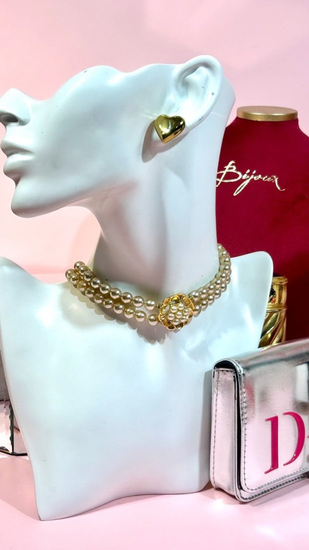 Kolia dwurzędowa, rozeta lekko ażurowa, pozłacana, ozdobiona dodatkowymi perłami - nieco mniejszymi niż w naszyjniku.