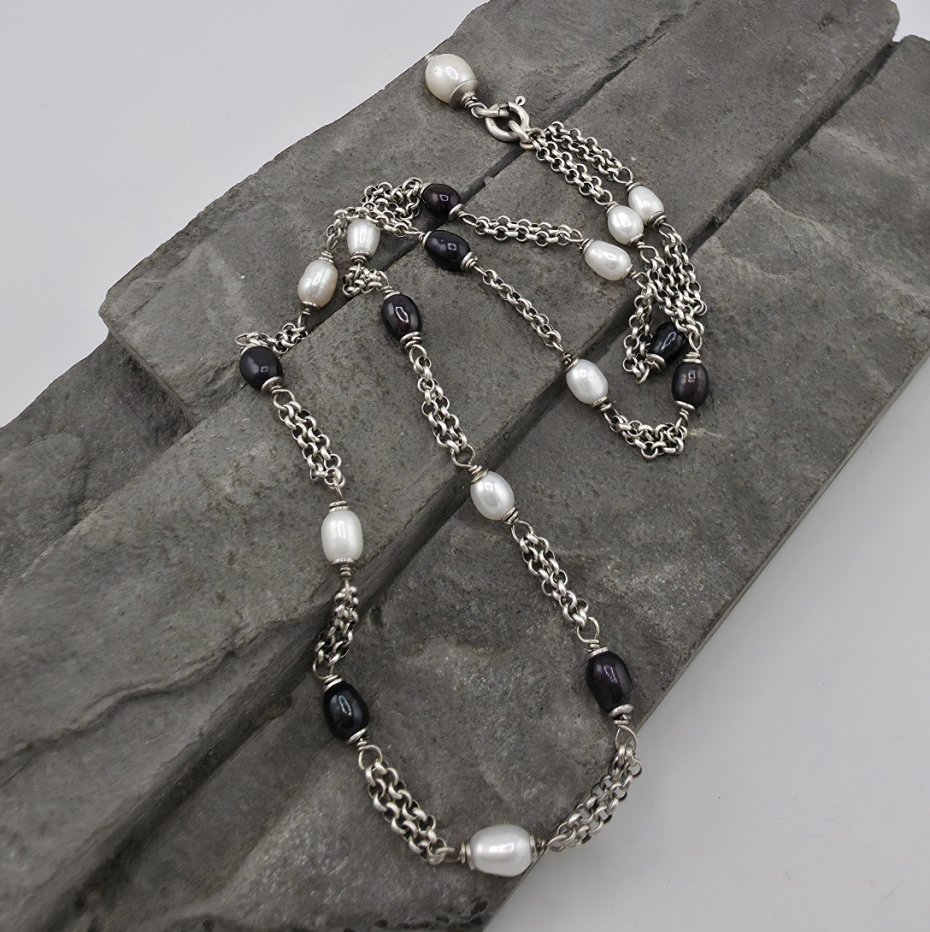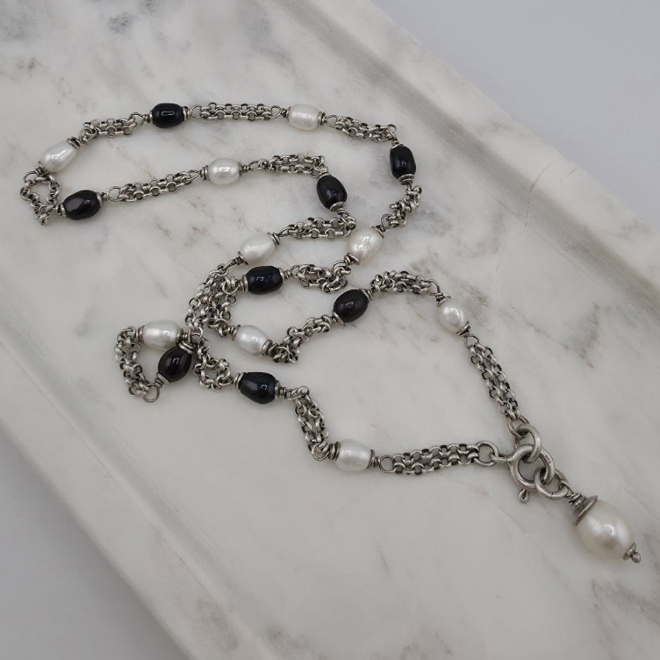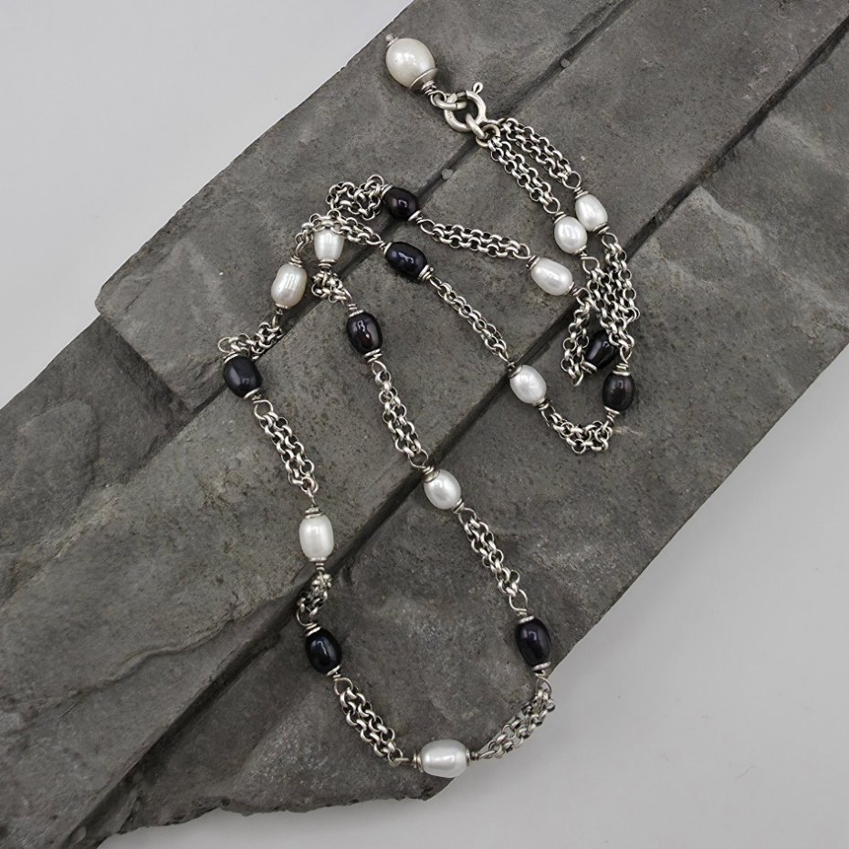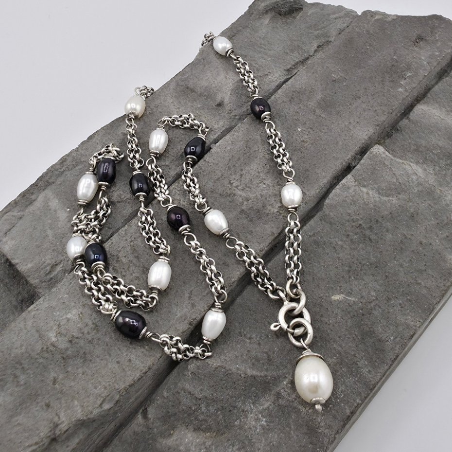 Uniwersalny, kobiecy i elegancki naszyjnik na co dzień i nie tylko. Wykonany w całości z oksydowanego srebra próby 925 oraz naturalnych pereł słodkowodnych w dwóch odcieniach wielkości ok. 6 mm. Całkowita długość naszyjnika to 50 cm. Do naszyjnika jest dołączona zawieszka z większą perłą i dzięki temu naszyjnik mozna nosić jak korale bez zawieszki lub z zawieszką z przodu. Ozdobnie zapakowany.