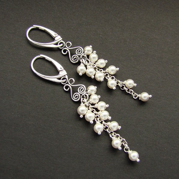 Delikatne, kobiece i eleganckie kolczyki na co dzień i na wielkie okazje, w tym na ślub. Wykonane w całości ze srebra próby 925 oraz białych perełek Swarovski wielkości 4 mm. Zapięcia zamykane angielskie. Całkowita długość kolczyków to ok. 7 cm. Ozdobnie zapakowane.