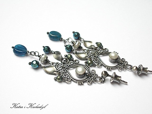 Kolczyki wykonane ze srebra [pr. 925] w połączeniu z fasetowanymi kuleczkami hematytów [4mm i 3mm] ,kropelkami apatytów [7mm] ,perełkami słodkowodnymi [4mm] oraz koronkowymi kandelabrami . Srebro oksydowane i przetarte. Całkowita długość kolczyków 5,6cm. Biżuteria ozdobnie zapakowana