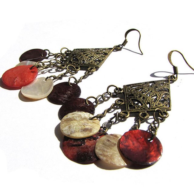 Połączenie mosiężnych elementów [ażurowe zawieszki mają 2,5 cm szerokości] z płatkami macicy perłowej w kolorze bieli, brązu i koralowego różu