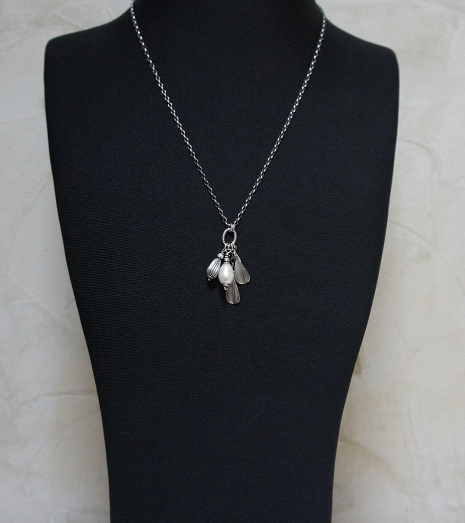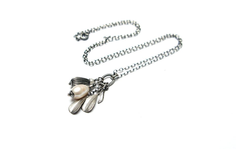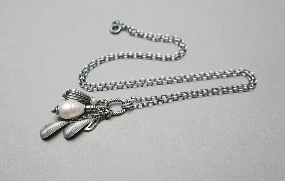 Naszyjnik wykonany ze srebra [pr. 925] w połączeniu z kroplą perły naturalnej [12mm] ,perełką sea shell [4mm] oraz srebrnymi zawieszkami . Srebro oksydowane i przetarte. Całkowita długość naszyjnika 53cm. Biżuteria ozdobnie zapakowana.