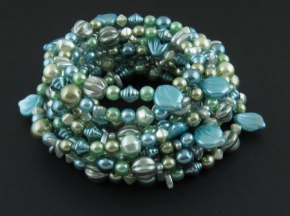 Naszyjnik wykonany z mnóstwa szklanych czeskich perełek oraz linki jubilerskiej, zapinany na karabińczyk, dzięki czemu łatwo można go umieścić również na nadgarstku jako bransoletkę, obwód 228 cm.