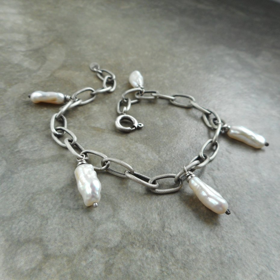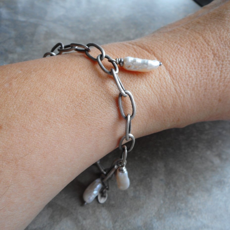 Oryginalna, jedyna bransoletka z kamieni naturalnych i szlachetnego srebra; charakteru biżuterii nadaje połączenie pereł hodowlanych w formie patyczków z fakturowanym, solidnym grubym łańcuchem o dużych oczkach ( 10 mm).