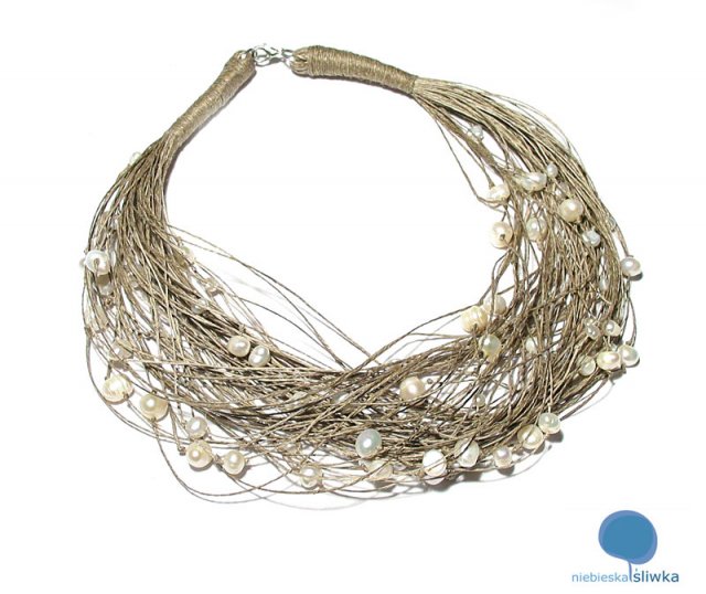 Delikatny i romantyczny naszyjnik wykonany na naturalnej przędzy lnianej z dodatkiem pereł słodkowodnych w kolorze naturalnym. Naszyjnik zapinany na posrebrzany karabińczyk, długość ok. 45 cm.