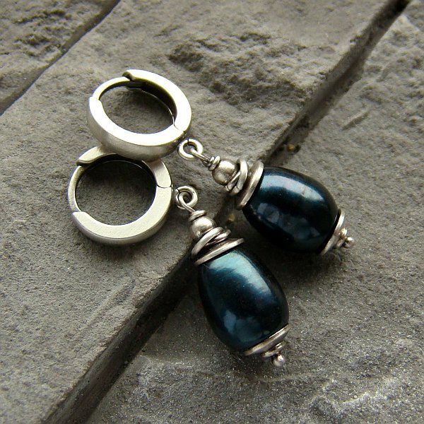 Proste, minimalistyczne kolczyki na co dzień. Wykonane w całości z oksydowanego srebra próby 925 oraz naturalnych, dużych pereł wielkości ok. 1,2x0,9 cm. Kolor pereł trudy do okreslenia, takie granatowe z domieszką ciemnej morskiej zieleni:) Długość całkowita to 3,6 cm. Bigle typu kajdanki. Ozdobnie zapakowane.