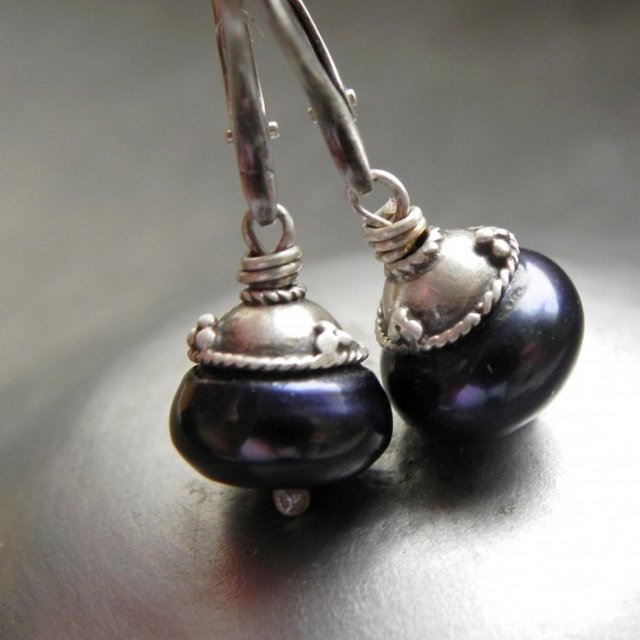Niewielkie, stylowe, piękne kolczyki wykonane zostały ze srebra próby 925, oksydowanego i przetartego oraz pereł słodkowodnych (10 mm). Długość całkowita kolczyków wynosi 3 cm.