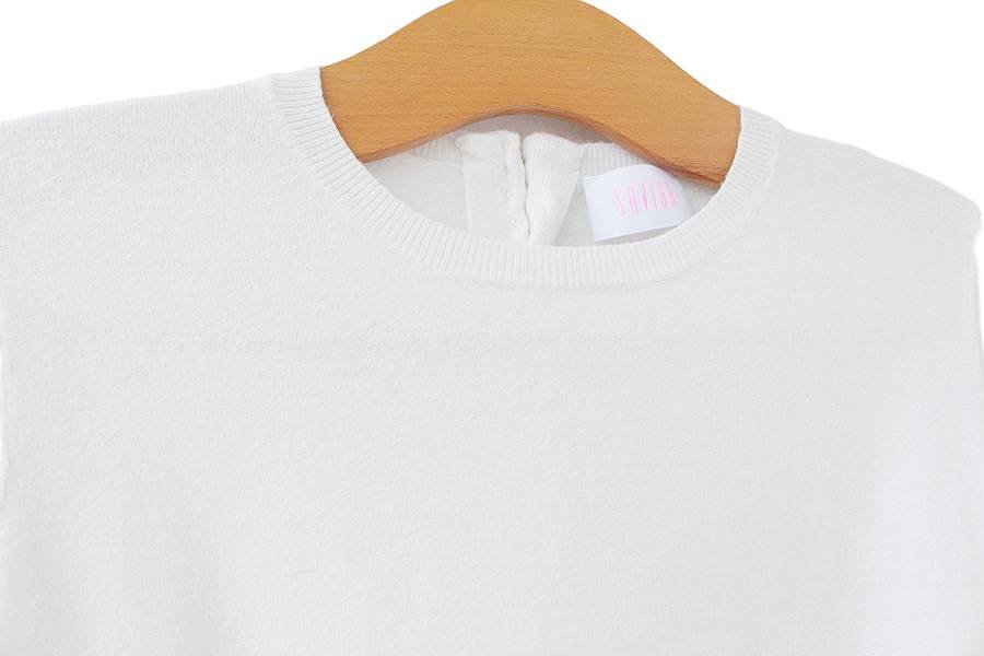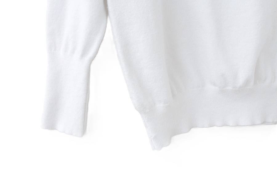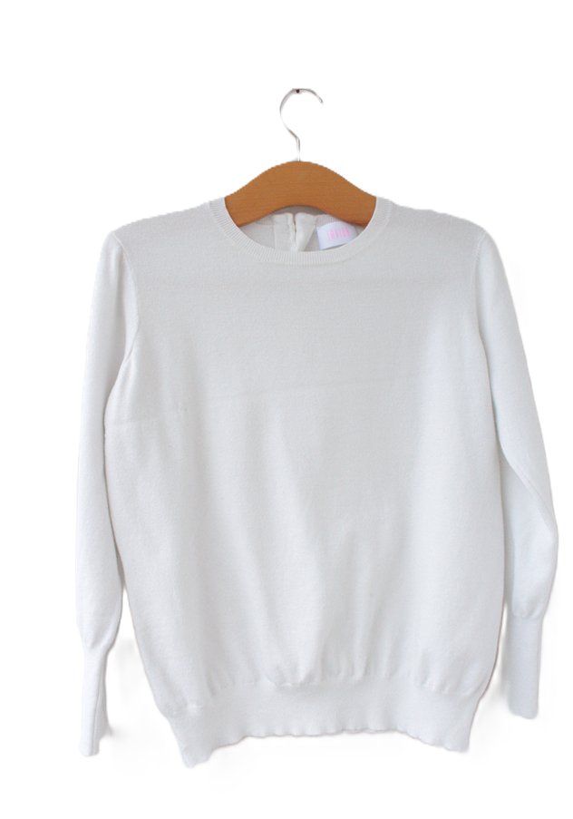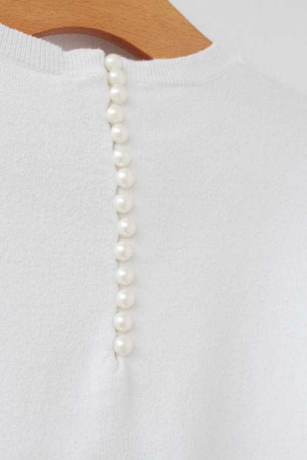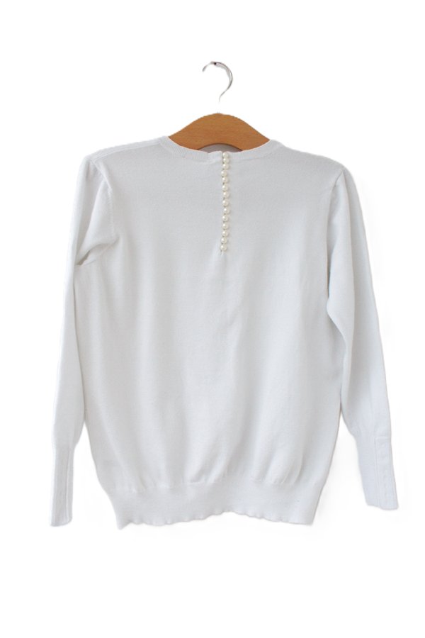 Nietuzinkowy sweterek vintage w kolorze białym. Prosty, klasyczny fason ciekawie urozmaica rząd perłowych guziczków z tyłu.