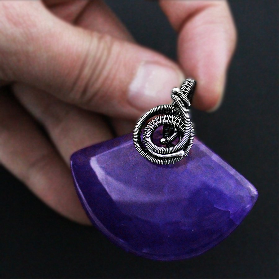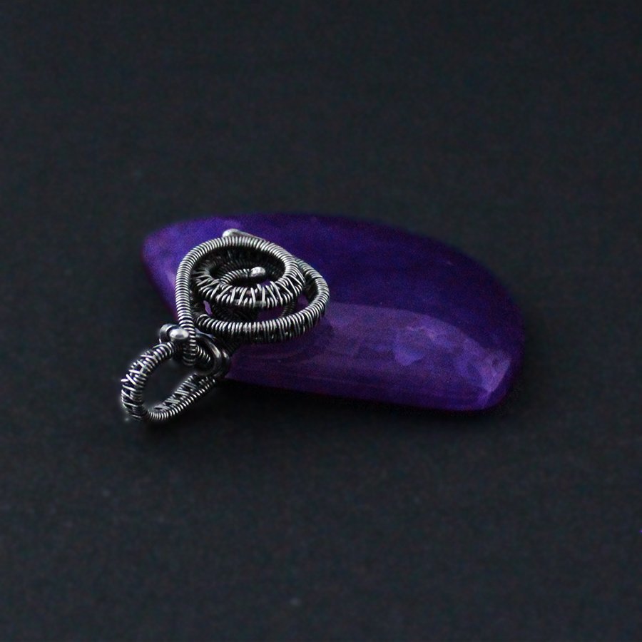 Kamień mierzy 3,5 x 5 x 0,6 cm, a jego wnętrze pod światło ukazuje delikatną przejrzystość, przez którą przebija chłodny, rozproszony prześwit koloru nieba. Całkowita długość wisiorka to 4,7 cm. Górna część została ręcznie opleciona ozdobnym splotem z oksydowanego srebra próby 999 i 925, wykonanym techniką wire-wrapping. Ciemna oksyda osiadająca w zagłębieniach dodaje całości wyrazistości i głębi. Otwór montażowy 0,7 x 0,5 cm pozwala na zawieszenie wisiorka na grubszym łańcuszku lub rzemieniu. Wisiorek zostanie zapakowany w eleganckie etui. Kolory mogą się nieznacznie różnić w zależności od ustawień monitora. Istnieje możliwość zamówienia dopasowanego łańcuszka – proszę o kontakt przed zakupem.