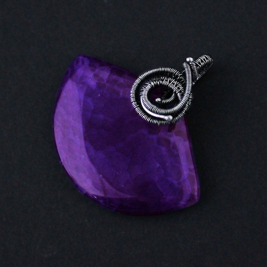 Wisiorek z agatem wężowym w kształcie wachlarza przyciąga wzrok intensywnym niebiesko-fioletowym kolorem oraz niezwykłą strukturą kamienia. Jego powierzchnia mieni się głębokimi odcieniami ultramaryny i ciemnego fioletu, przeplatającymi się niczym pociągnięcia pędzla. Kamień od góry przechodzi z chłodnych niebieskich tonów coraz ciemniejsze barwy u podstawy – aż po niemal fioletową głębię. Na jego tle wyraźnie rysuje się naturalna siatka drobnych spękań charakterystyczna dla agatu wężowego – nieregularna, organiczna, przypominająca wzór skóry węża.