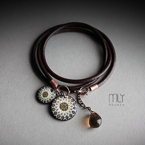 Efektowna bransoletka wykonana z rzemienia jubilerskiego elementów w kolorze miedzi i ręcznie wykonanej ceramicznej zawieszki, szkliwionych mieszanką białokremowych szkliw o subtelnym połysku, dekorowanych autorską kalką ceramiczną.Obwód regulowany. Polecam. Termin realizacji zamówienia to 1-2 dni.