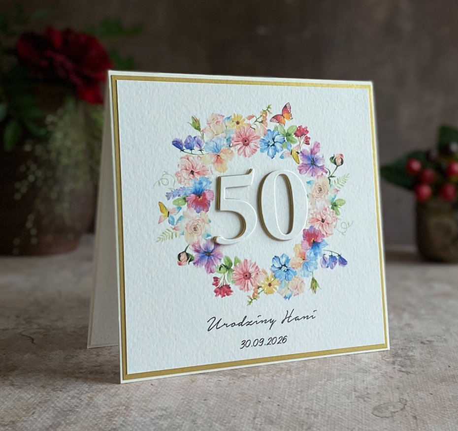 Elegancka, ręcznie wykonana, personalizowana kartka z okazji 50-tych urodzin. Produkt z naszej autorskiej kolekcji - BE HAPPY!