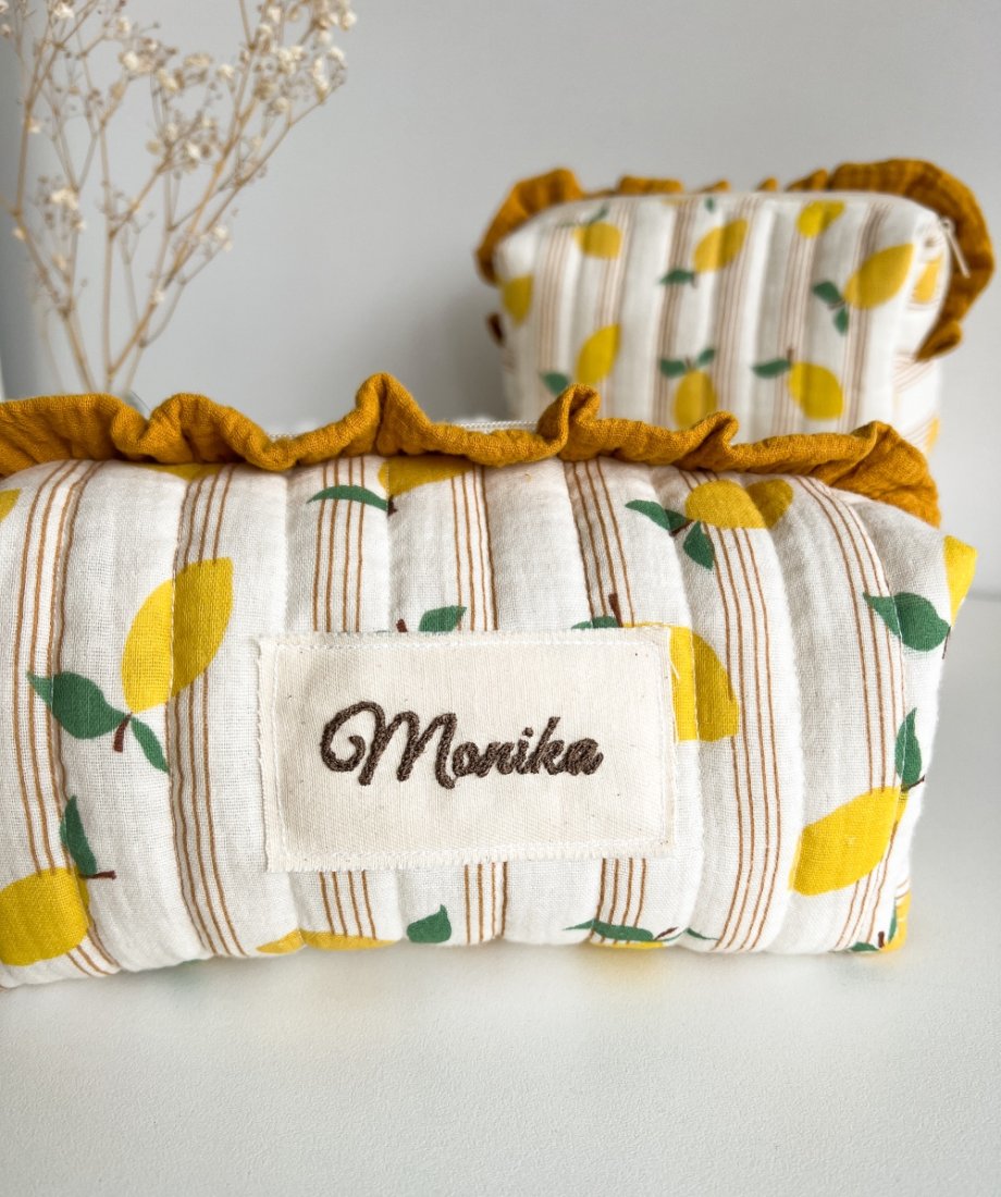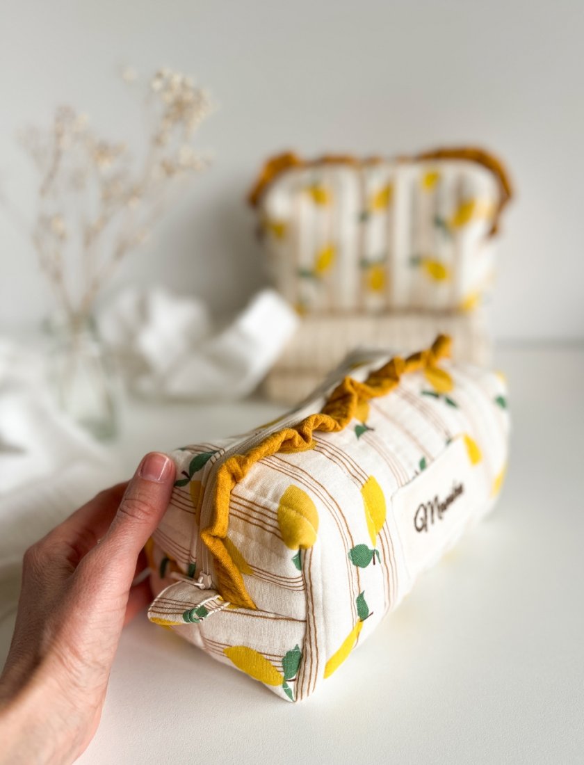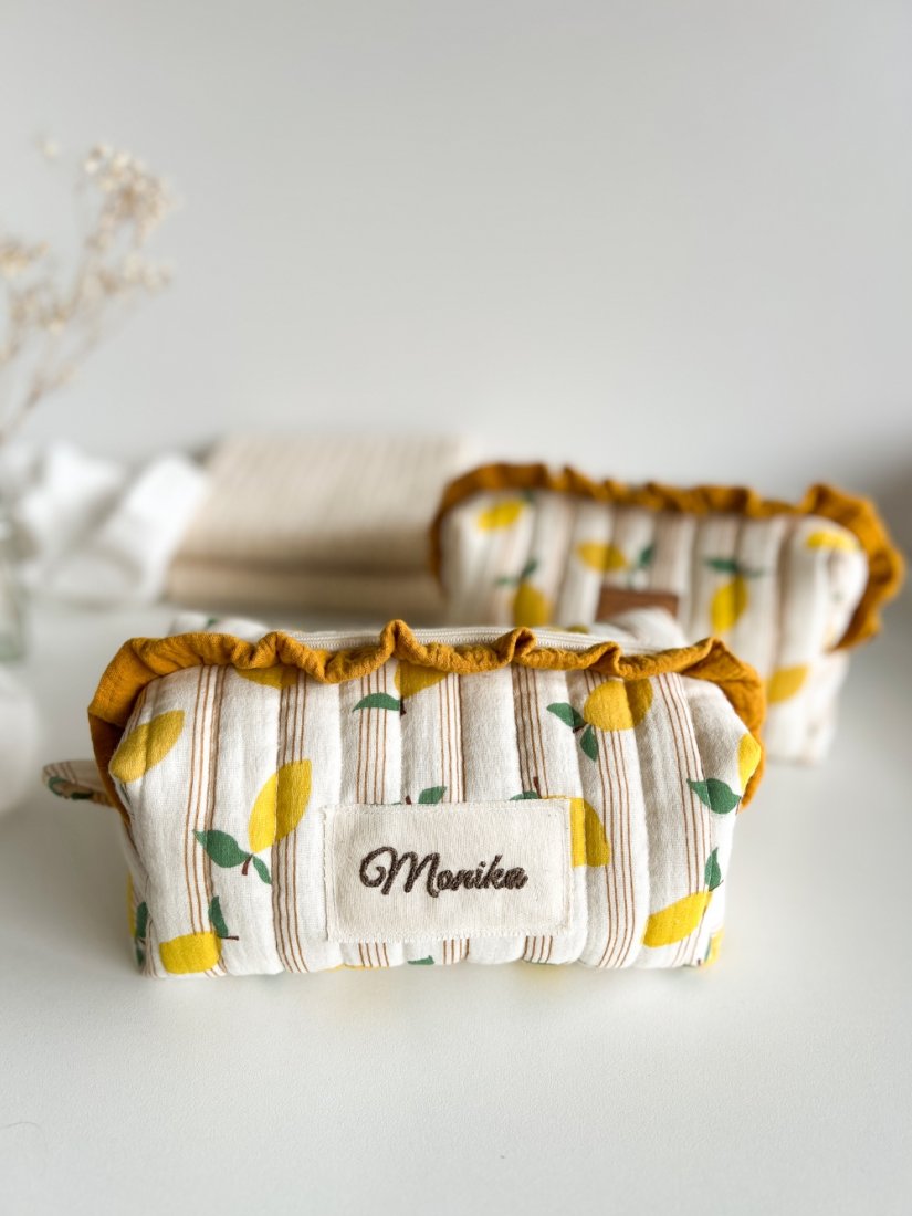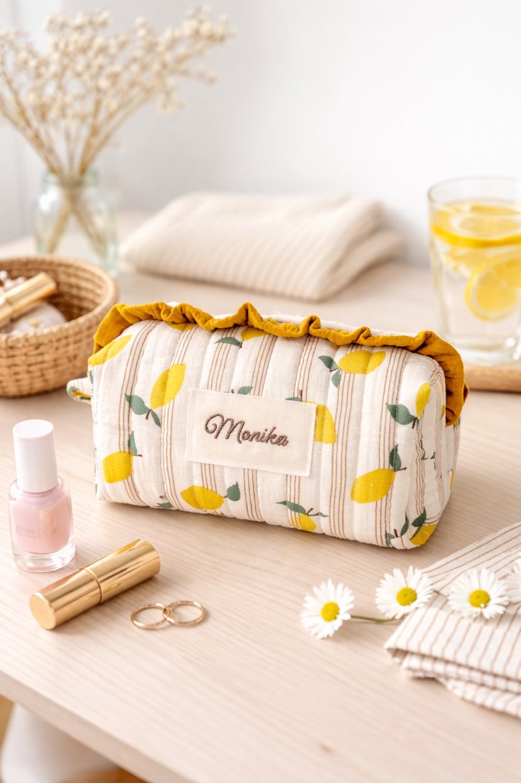 Miękka, ręcznie wykonana kosmetyczka z personalizowanym haftem — idealna na co dzień i w podróży.