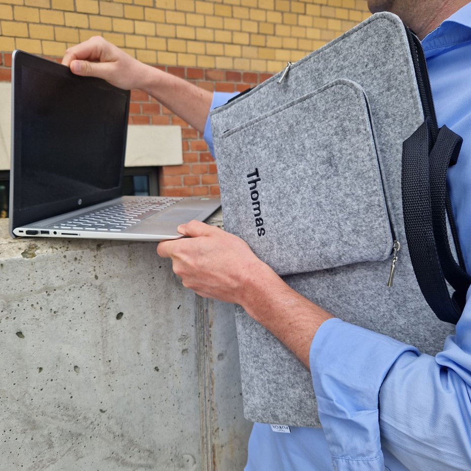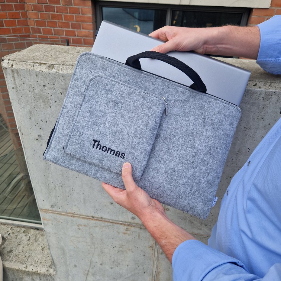 Personalizowane etui z filcu na laptopa z kieszonką i rączką.