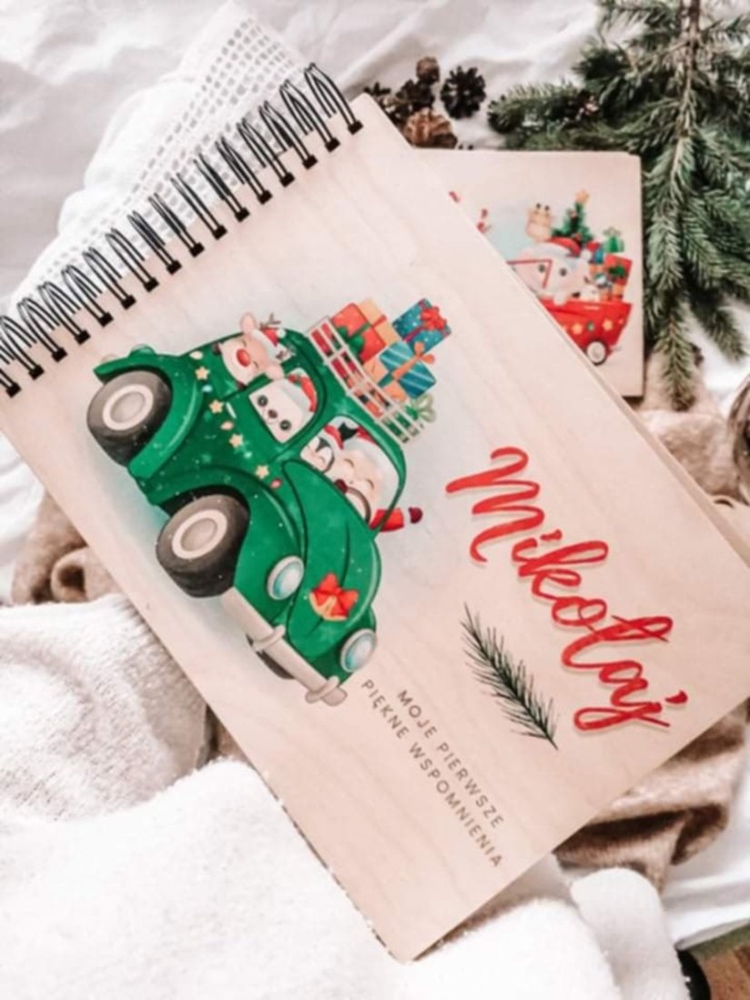 Zatrzymaj w kadrze magię świąt i pierwsze piękne wspomnienia Twojego maluszka w unikalnym, personalizowanym drewnianym albumie na zdjęcia z uroczą grafiką zielonego autka pełnego prezentów! To nie tylko funkcjonalny album, ale również wyjątkowa pamiątka, która będzie cieszyć przez lata.