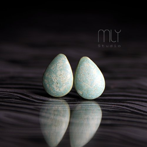 Oryginalne ceramiczne kolczyki w formie sztyftów, ręcznie wykonane z delikatnej gliny kamionkowej, jednostronnie szkliwione mieszanką zielonych szkliw z efektem plamek, na antyalergicznych sztyftach w kolorze srebrnym. Długość ok 13mm