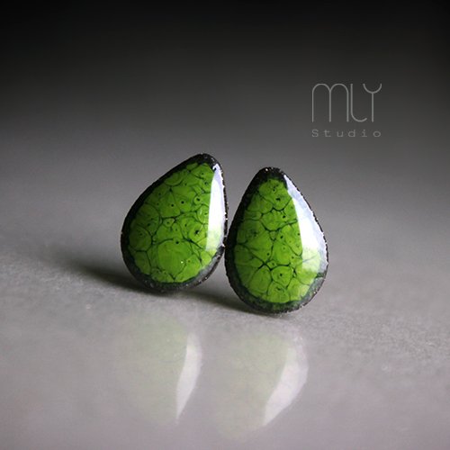 Oryginalne ceramiczne kolczyki w formie sztyftów, ręcznie wykonane z delikatnej gliny kamionkowej, jednostronnie szkliwione mieszanką zielonych szkliw z efektem plamek, na antyalergicznych sztyftach w kolorze srebrnym. Długość ok 13mm