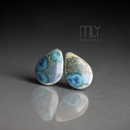 Ceramiczne kolczyki w formie sztyftów, ręcznie wykonane z delikatnej gliny kamionkowej, jednostronnie szkliwione mieszanką błękitnych i szarych szkliw z efektem plamek i krystalizacji, na antyalergicznych sztyftach w kolorze srebrnym. Długość ok. 13mm. Polecam