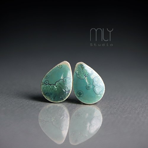 Ceramiczne kolczyki w formie sztyftów, ręcznie wykonane z delikatnej gliny kamionkowej, jednostronnie szkliwione mieszanką zielonych szkliw z efektem plamek i krystalizacji, na antyalergicznych sztyftach w kolorze srebrnym. Długość ok. 13mm. Polecam