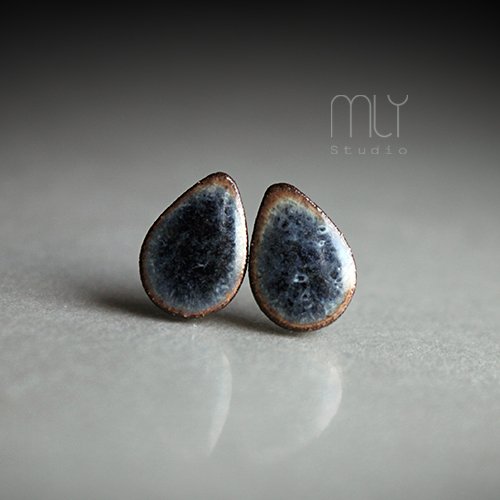 Oryginalne ceramiczne kolczyki w formie sztyftów, ręcznie wykonane z delikatnej gliny kamionkowej, jednostronnie szkliwione szarym szkliwem z efektem plamek, na antyalergicznych sztyftach w kolorze srebrnym. Długość ok 13mm