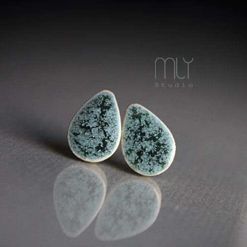 Oryginalne ceramiczne kolczyki w formie sztyftów, ręcznie wykonane z delikatnej gliny kamionkowej, jednostronnie szkliwione mieszanką zielonych szkliw z efektem plamek, na antyalergicznych sztyftach w kolorze srebrnym. Długość ok 13mm