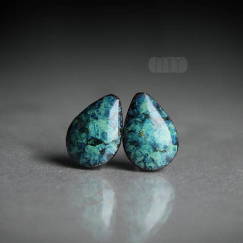 Oryginalne ceramiczne kolczyki w formie sztyftów, ręcznie wykonane z delikatnej gliny kamionkowej, jednostronnie szkliwione mieszanką zielonych szkliw z efektem plamek, na antyalergicznych sztyftach w kolorze srebrnym. Długość ok 13mm