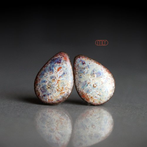 Oryginalne ceramiczne kolczyki w formie sztyftów, ręcznie wykonane z delikatnej gliny kamionkowej, jednostronnie szkliwione brązowo beżowym szkliwem z efektem plamek, na antyalergicznych sztyftach w kolorze srebrnym. Długość ok 13mm