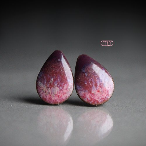 Oryginalne ceramiczne kolczyki w formie sztyftów, ręcznie wykonane z delikatnej gliny kamionkowej, jednostronnie szkliwione mieszanką różowych i fioletowych szkliw z efektem plamek, na antyalergicznych sztyftach w kolorze srebrnym. Długość ok 13mm
