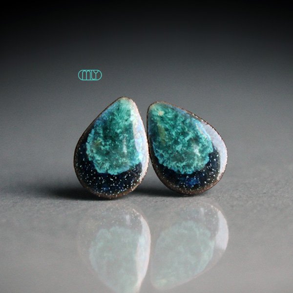 Oryginalne ceramiczne kolczyki w formie sztyftów, ręcznie wykonane z delikatnej gliny kamionkowej, jednostronnie szkliwione mieszanką zielonych szkliw z efektem plamek, na antyalergicznych sztyftach w kolorze srebrnym. Długość ok 13mm