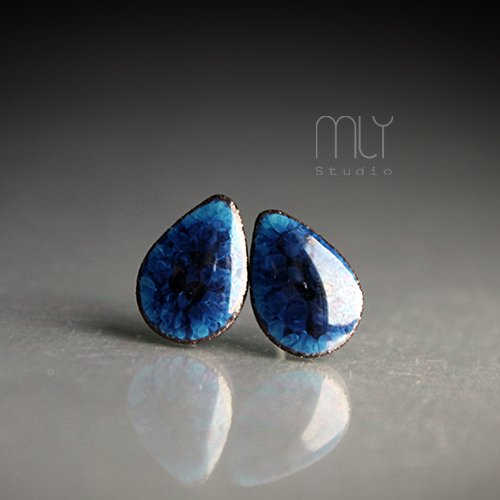 Oryginalne ceramiczne kolczyki w formie sztyftów, ręcznie wykonane z delikatnej gliny kamionkowej, jednostronnie szkliwione mieszanką błękitnych szkliw z efektem plamek, na antyalergicznych sztyftach w kolorze srebrnym. Długość ok 13mm