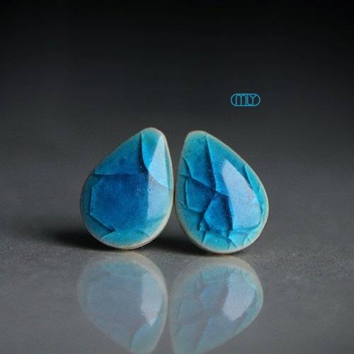 Oryginalne ceramiczne kolczyki w formie sztyftów, ręcznie wykonane z delikatnej gliny kamionkowej, jednostronnie szkliwione mieszanką błękitnych szkliw z efektem plamek, na antyalergicznych sztyftach w kolorze srebrnym. Długość ok 13mm