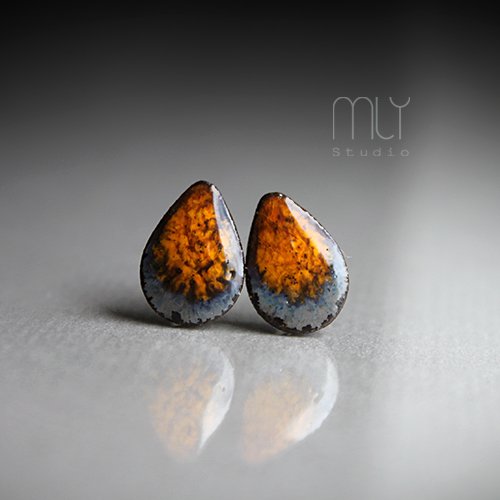 Ceramiczne kolczyki w formie sztyftów, ręcznie wykonane z delikatnej gliny kamionkowej, jednostronnie szkliwione mieszanką szaro pomarańczowych szkliw z efektem plamek, na antyalergicznych sztyftach w kolorze srebrnym.Średnica ok. 13mm.Polecam
