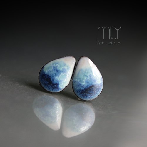 Oryginalne ceramiczne kolczyki w formie sztyftów, ręcznie wykonane z delikatnej gliny kamionkowej, jednostronnie szkliwione mieszanką błękitnych i bialoperłowych szkliw z efektem plamek, na antyalergicznych sztyftach w kolorze srebrnym. Długość ok 13mm